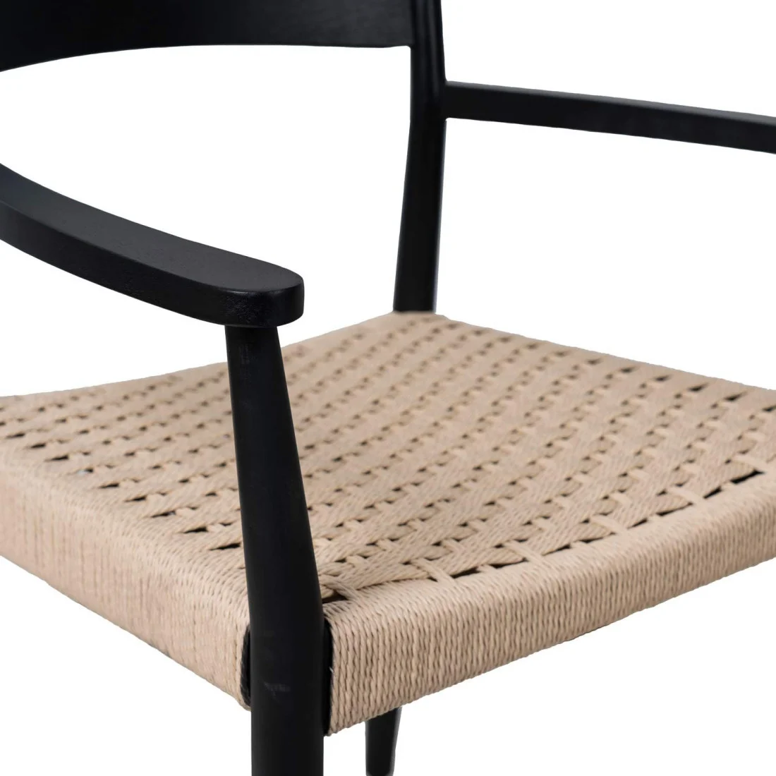 El asiento, elaborado con cuerda trenzada en tono beige, ofrece no solo un atractivo contraste visual, sino también una sensación de comodidad y frescura. Su trenzado artesanal refuerza su estética rústica y refinada, perfecta para quienes buscan un mobiliario con personalidad y calidez.