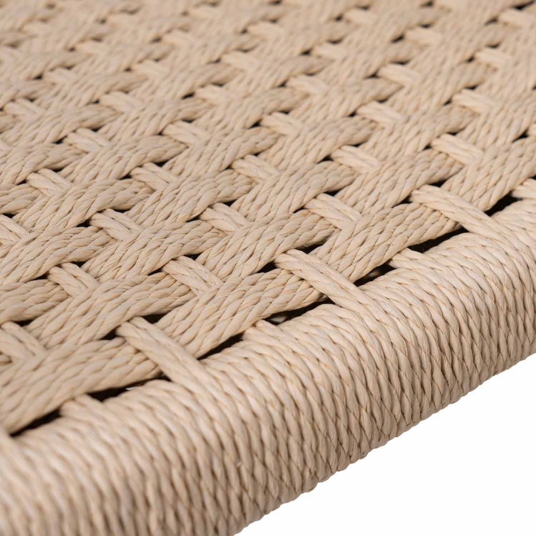 El asiento, elaborado con cuerda trenzada en tono beige, ofrece no solo un atractivo contraste visual, sino también una sensación de comodidad y frescura. Su trenzado artesanal refuerza su estética rústica y refinada, perfecta para quienes buscan un mobiliario con personalidad y calidez.
