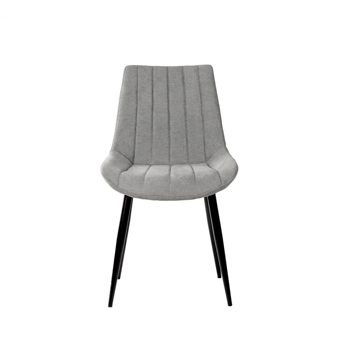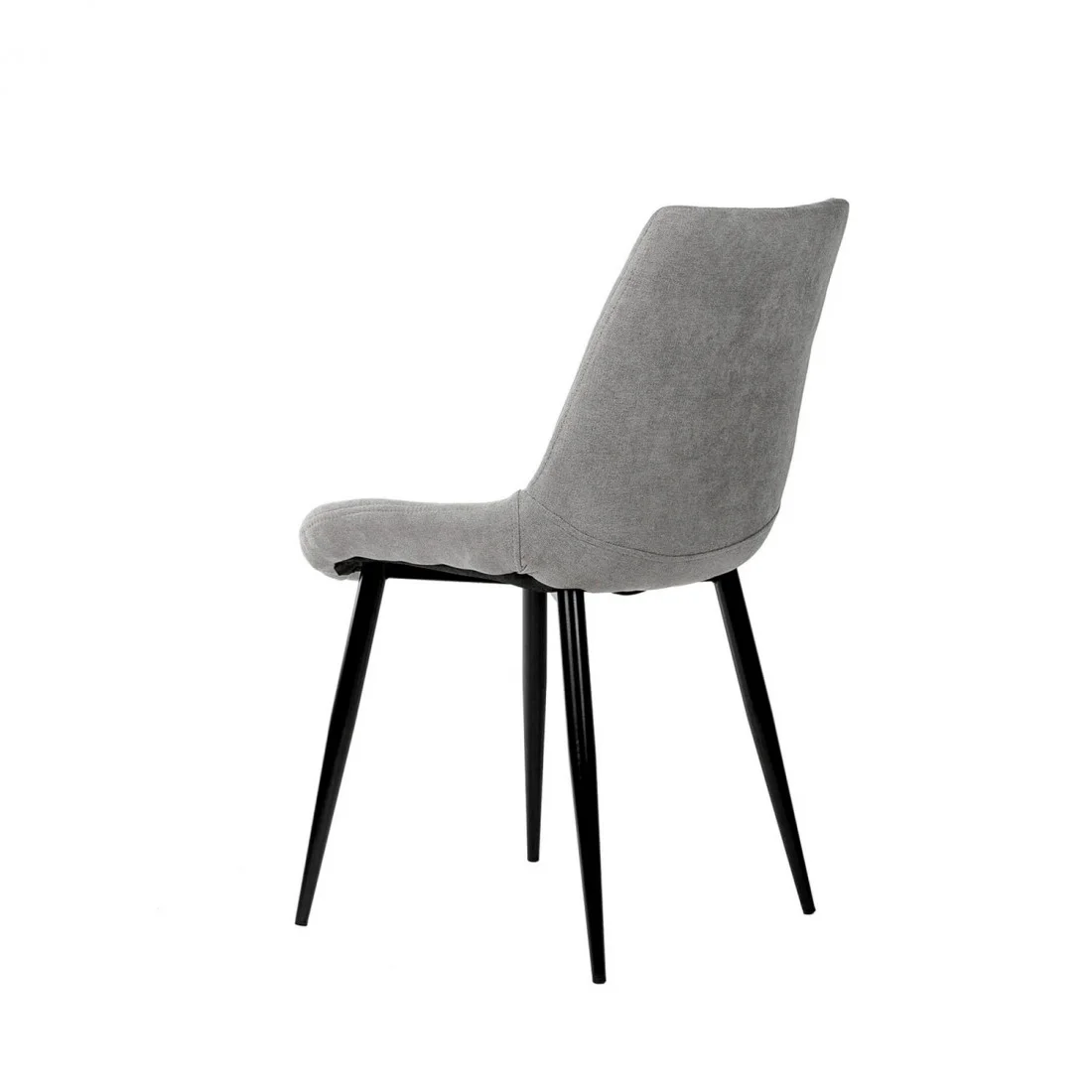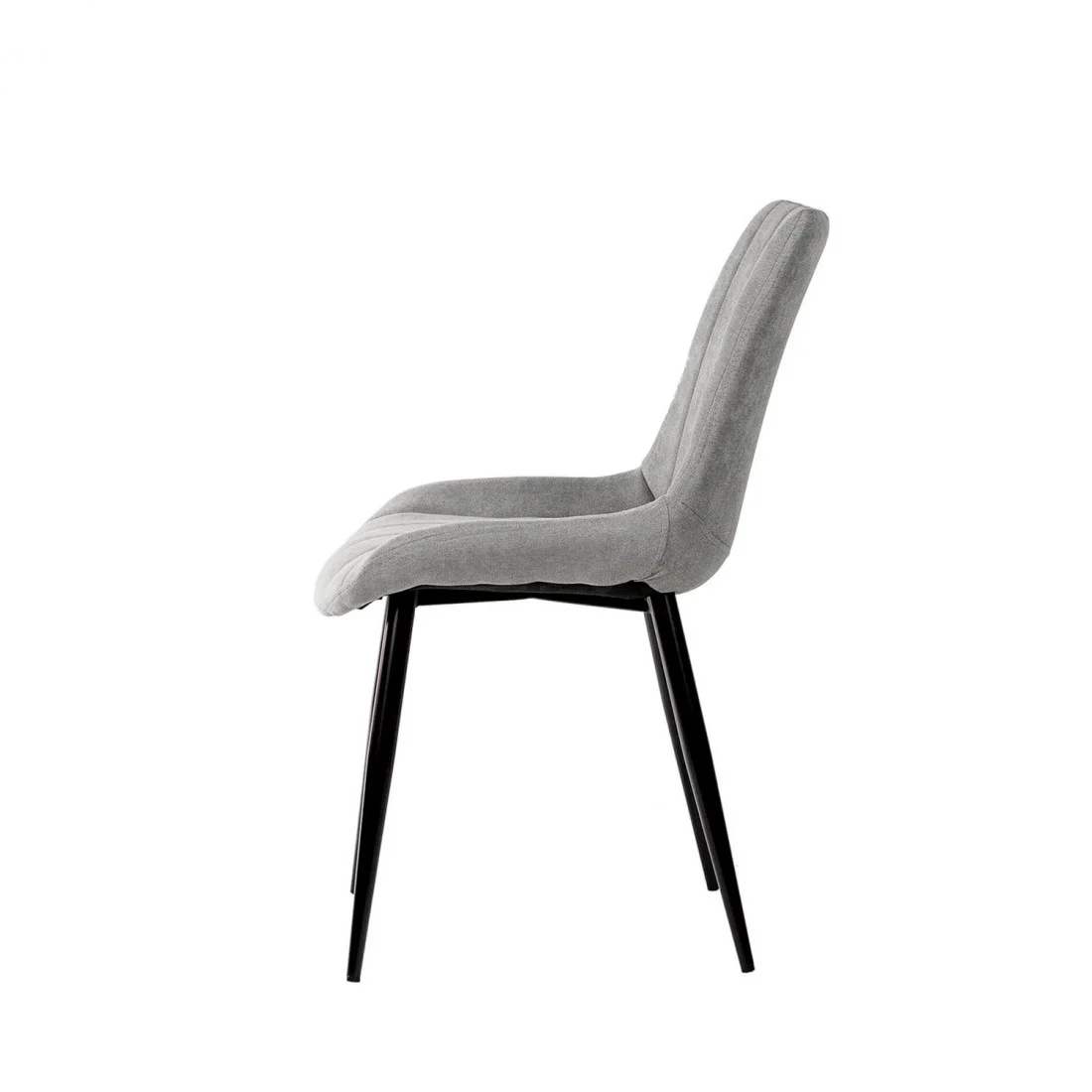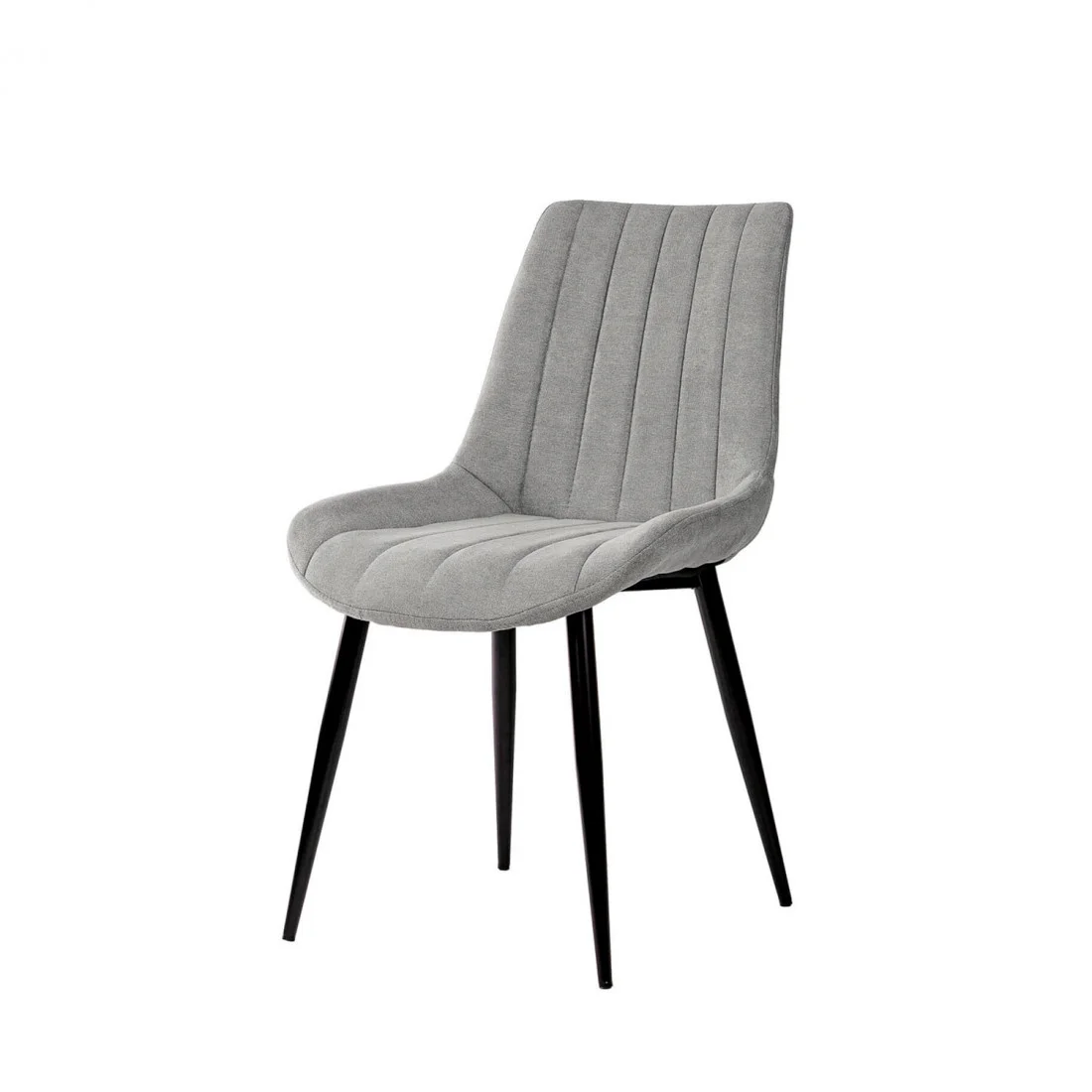 El tapizado en color gris claro, con una textura de líneas horizontales, aporta un toque de sofisticación y modernidad. Las patas cónicas metálicas, acabadas en color negro, no solo añaden un contraste visual atractivo, sino que también garantizan estabilidad y durabilidad.