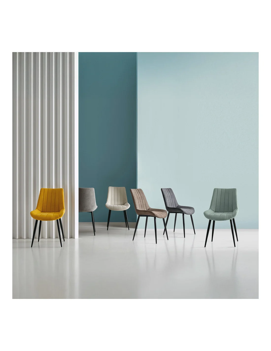 La combinación de dos tejidos diferentes en color menta hace de la silla FAINA un artículo muy especial.