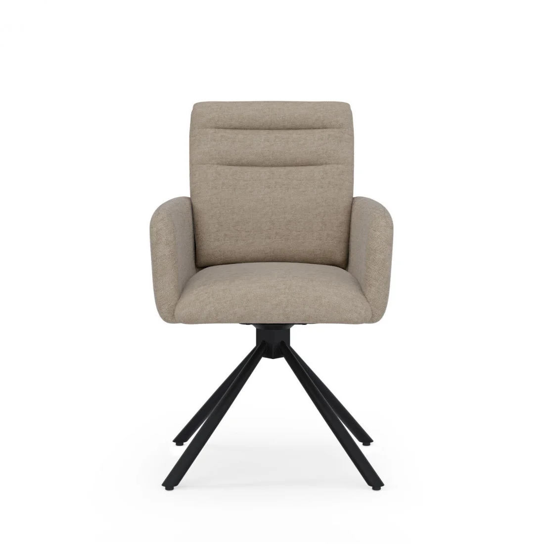 El asiento está tapizado en tela de color taupe (100% poliéster), proporcionando un tono neutro y sofisticado. La estructura y las patas de metal añaden un toque moderno y resistente.