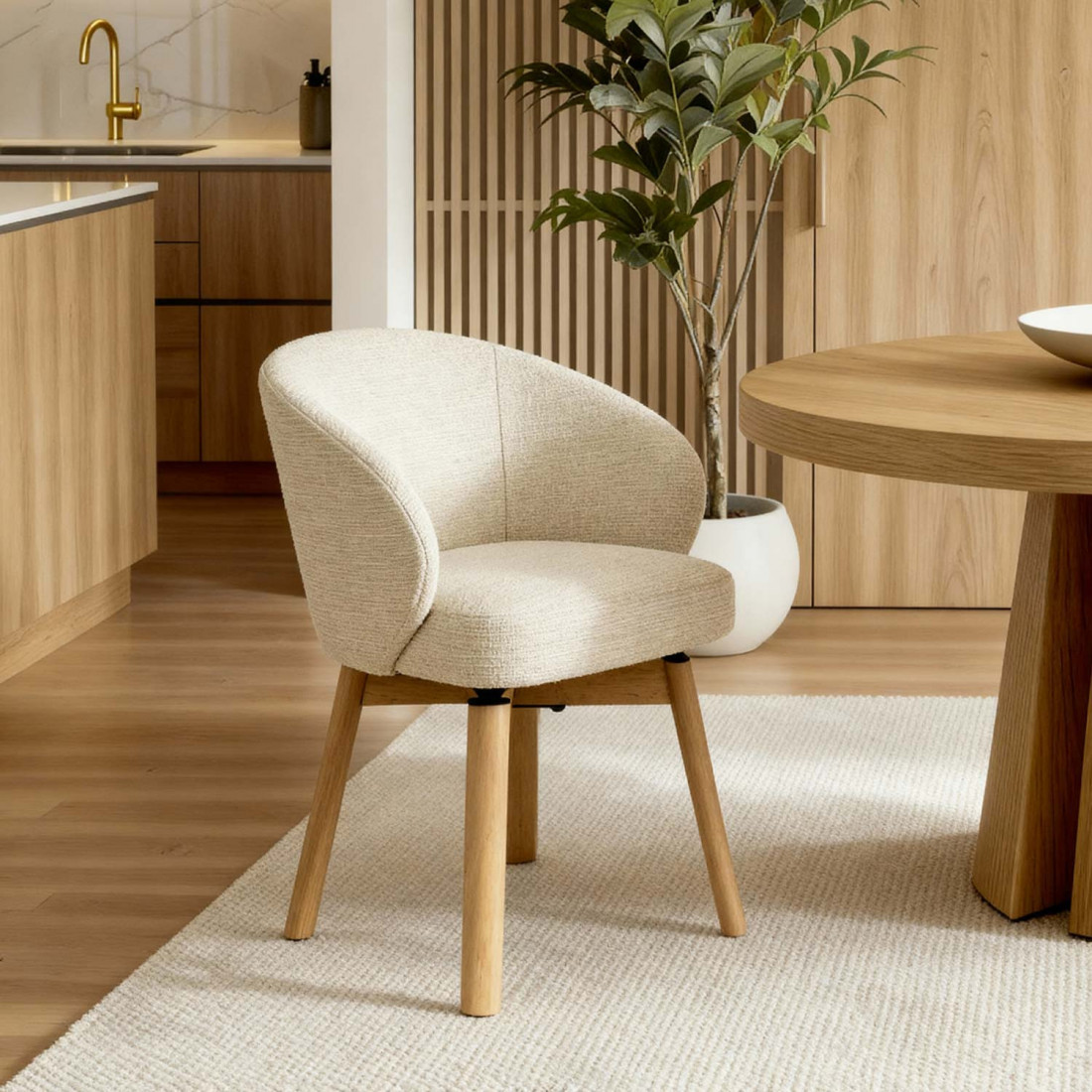 La silla VIRGINIA es la definición de calidez moderna. Su diseño envolvente y acogedor se alza sobre unas elegantes patas de madera de haya, cuya tonalidad natural añade un toque orgánico y atemporal al conjunto.