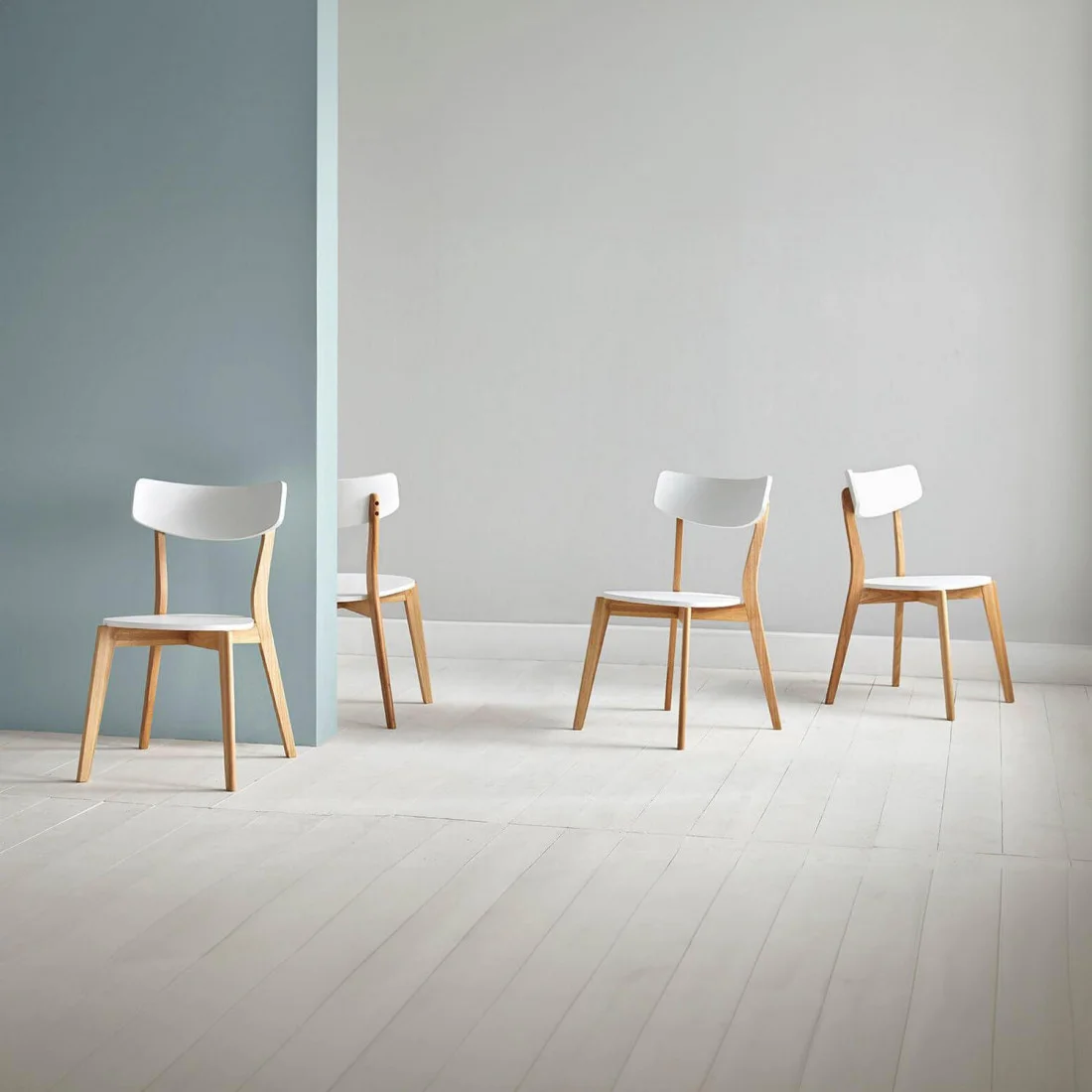 La silla AVA posee un encanto único gracias a la combinación de su asiento y respaldo en color blanco con su estructura y patas de acabado en roble.