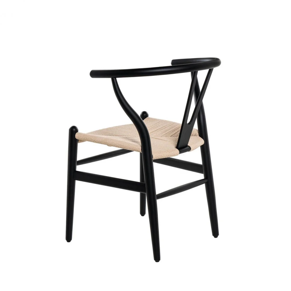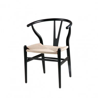 Está compuesta por un asiento de cuerda de fibra natural y un llamativo respaldo arqueado que ofrece comodidad y un diseño ergonómico.