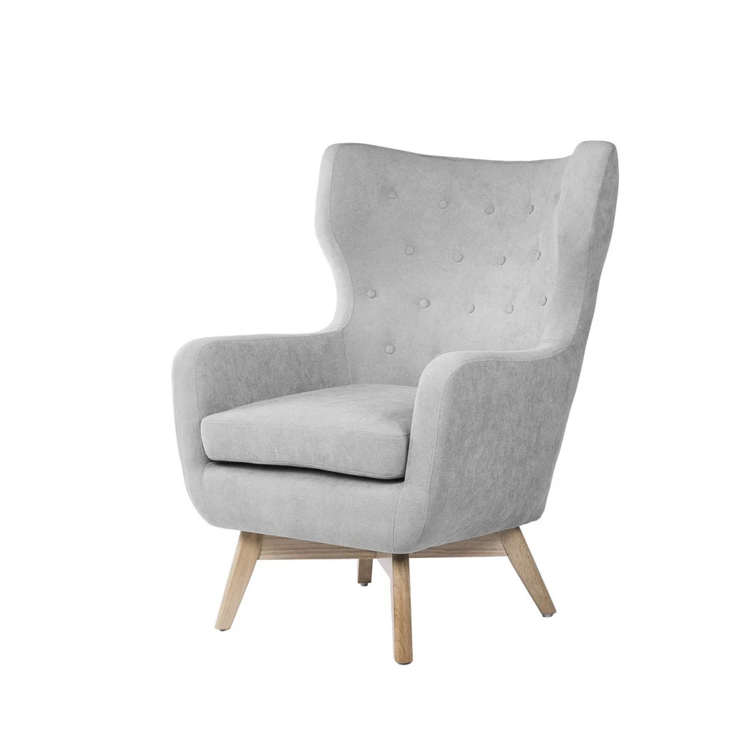 El respaldo, alto y envolvente, incorpora orejeras laterales y un delicado detalle de botones capitoné, elementos que refuerzan su carácter sofisticado y atemporal.