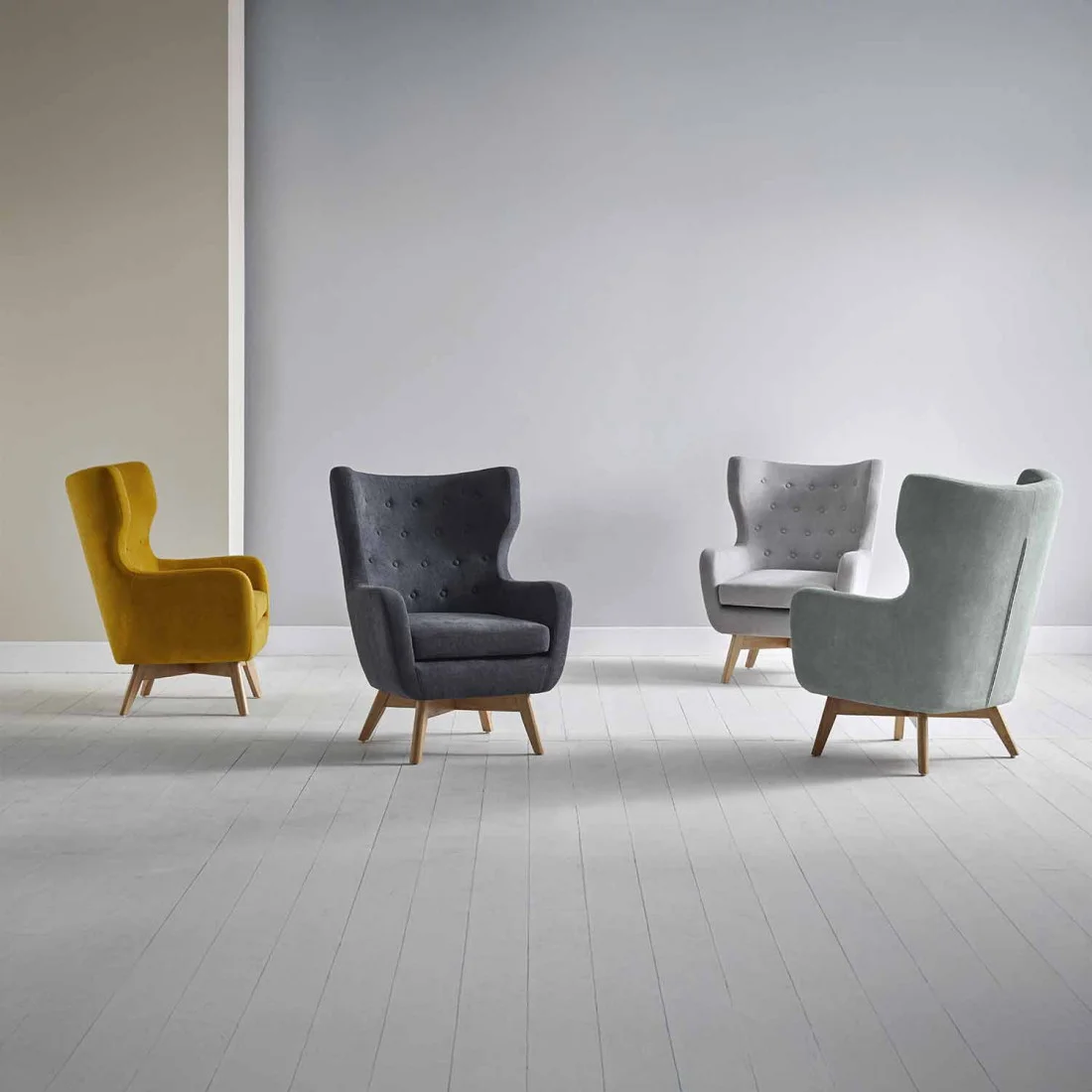 Con su original estructura de patas de madera, ofrece una experiencia acogedora que se adapta perfectamente a salones, dormitorios o rincones de lectura.