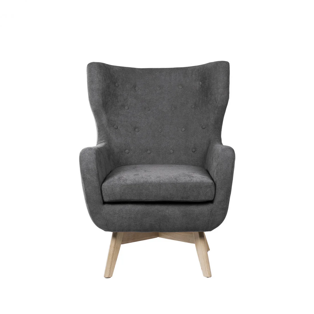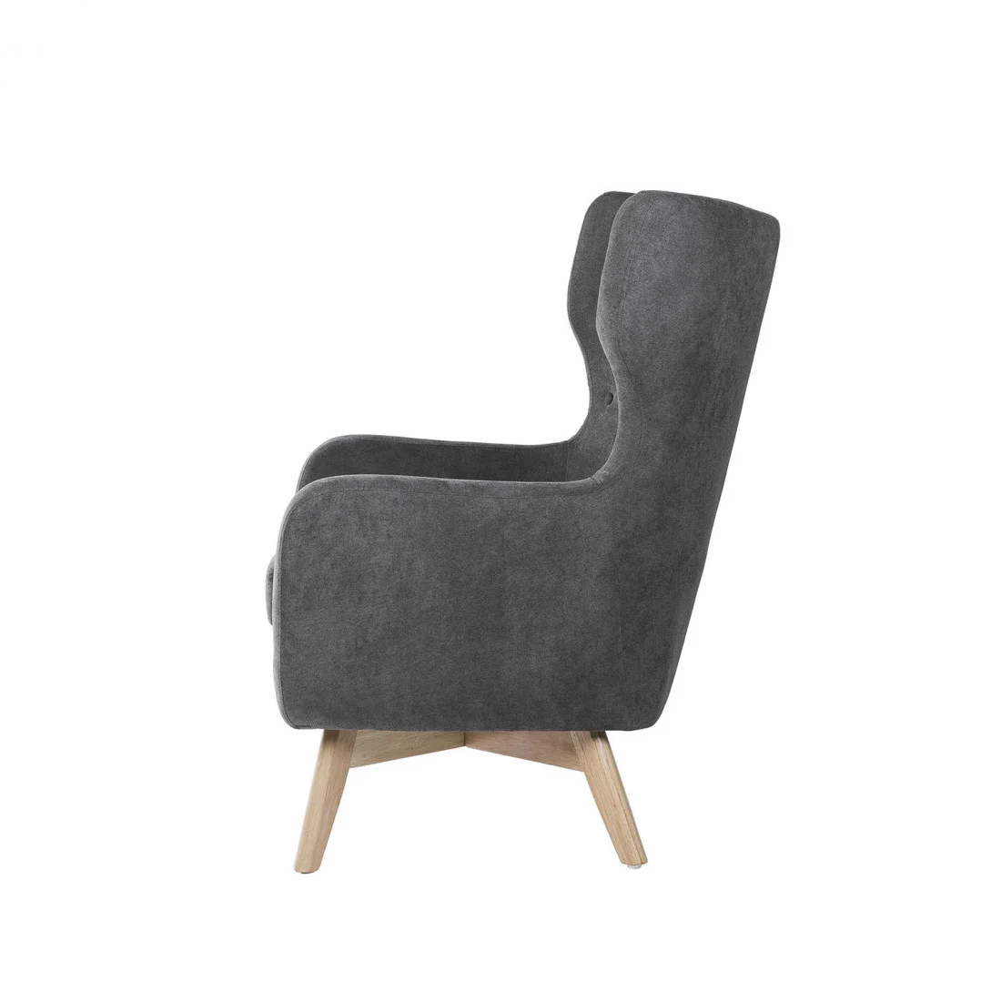 El respaldo, alto y envolvente, incorpora orejeras laterales y un delicado detalle de botones capitoné, elementos que refuerzan su carácter sofisticado y atemporal.
