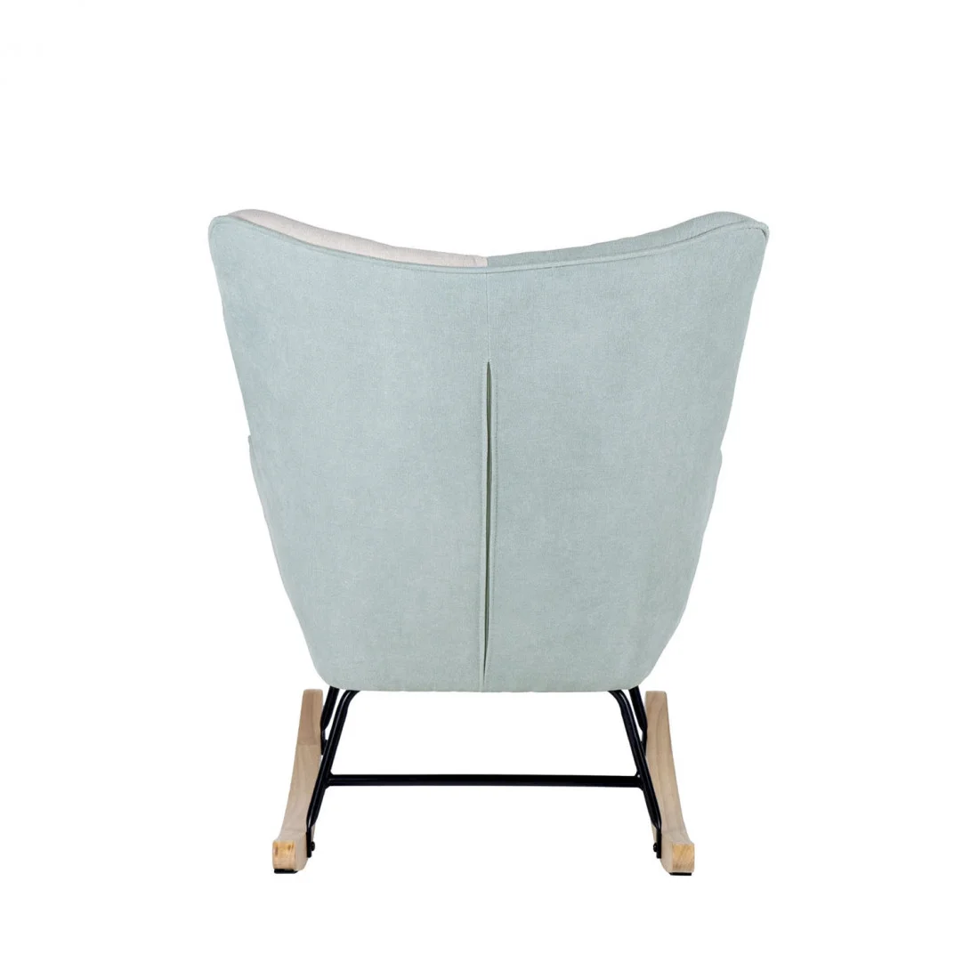 Su estructura de acero en color negro asegura firmeza y durabilidad, mientras que la base tipo patín, elaborada en madera con acabado natural, aporta calidez y un suave vaivén que invita al descanso. Esta mezcla de materiales industriales y detalles orgánicos genera un equilibrio perfecto entre lo moderno y lo acogedor.