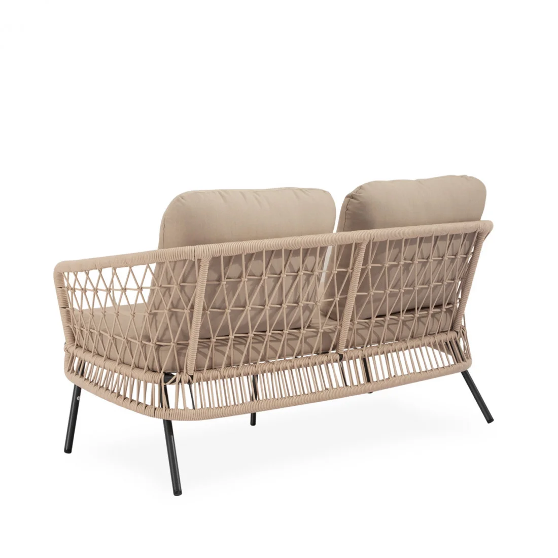 El conjunto ODESA combina diseño mediterráneo y resistencia para disfrutar del exterior con estilo. Incluye dos butacas, un sofá doble y una mesa de centro con tapa de cristal templado de 5 mm de grosor. Su estructura de acero galvanizado se entrelaza con cuerda sintética en tono beige, creando una estética cálida y ligera.