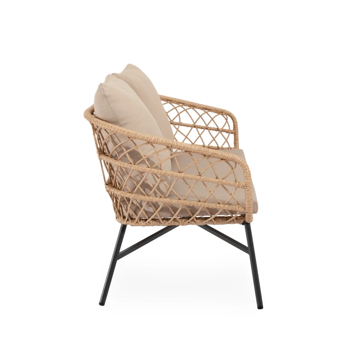 Su estructura de acero galvanizado se combina con cuerda trenzada en acabado natural, aportando calidez y un aire artesanal. Los cojines, cómodos y resistentes, completan un conjunto versátil, pensado para jardines, terrazas o porches que buscan estilo sin renunciar a la funcionalidad.