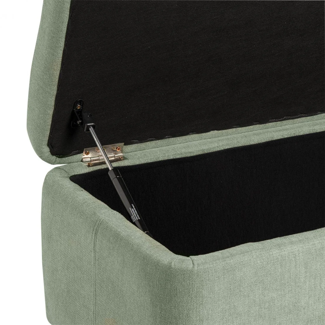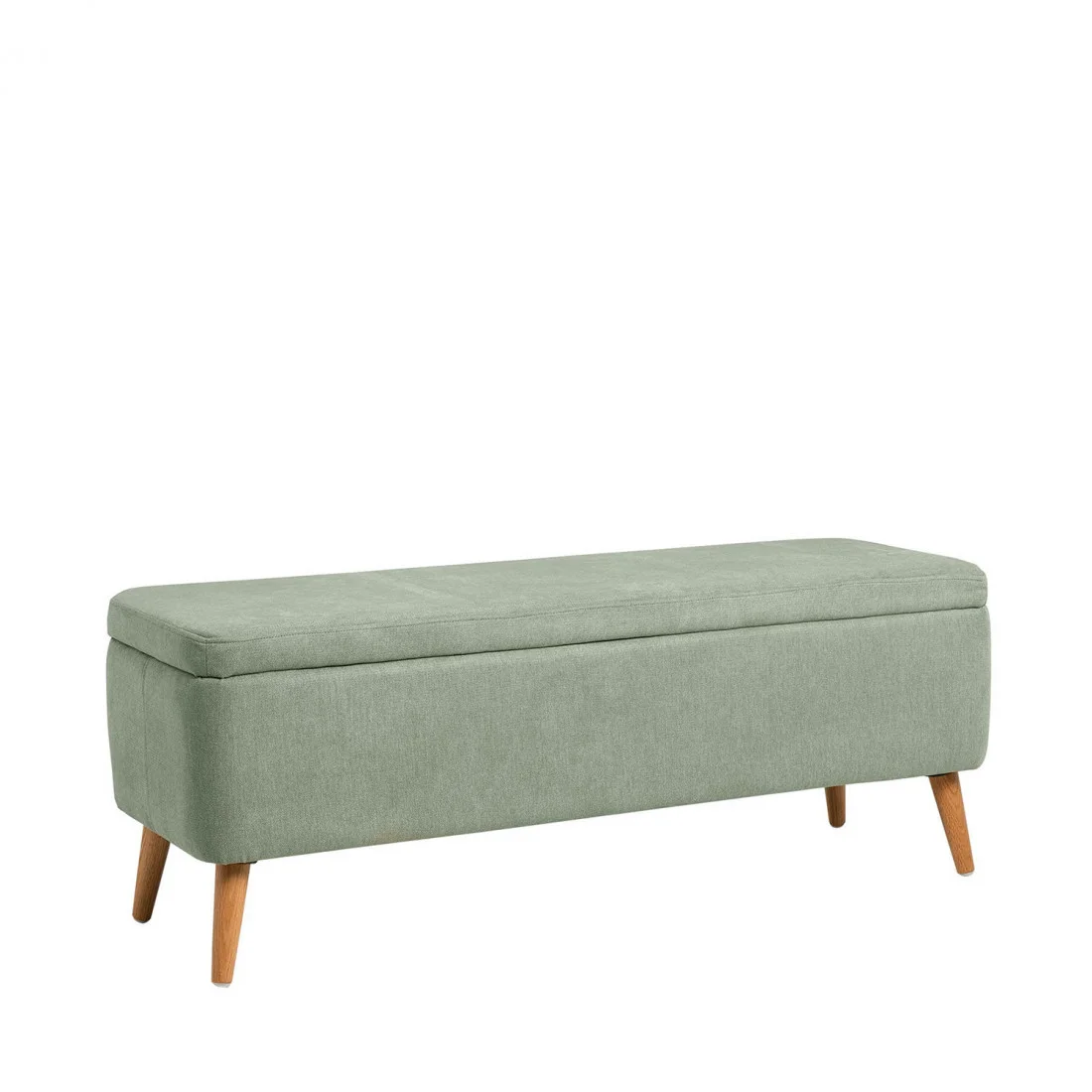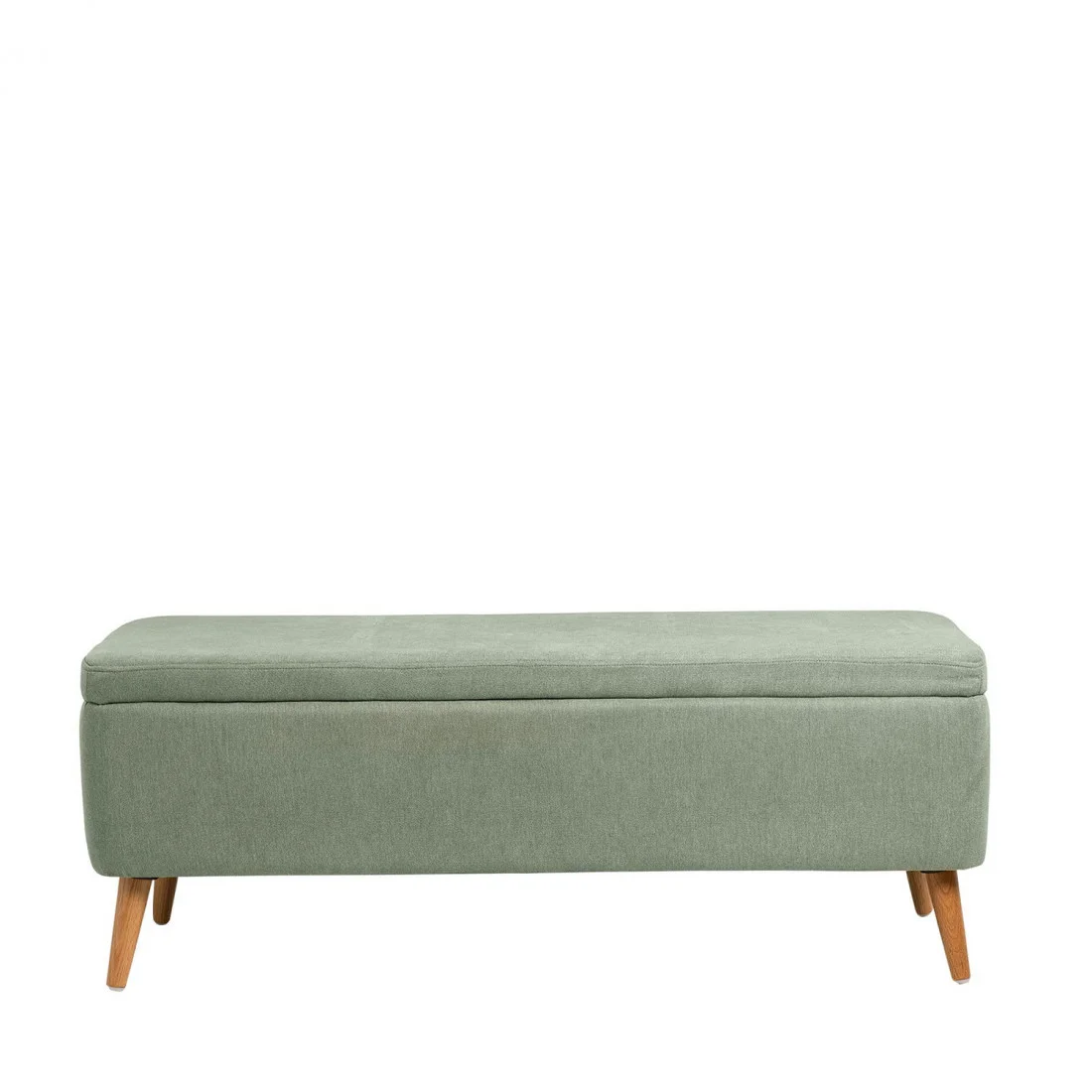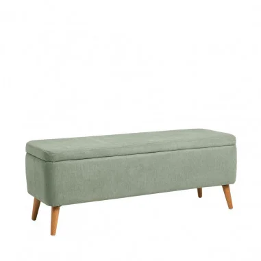 Su asiento tapizado esconde un práctico compartimento de almacenaje, ideal para guardar textiles, calzado o pequeños objetos del día a día.
