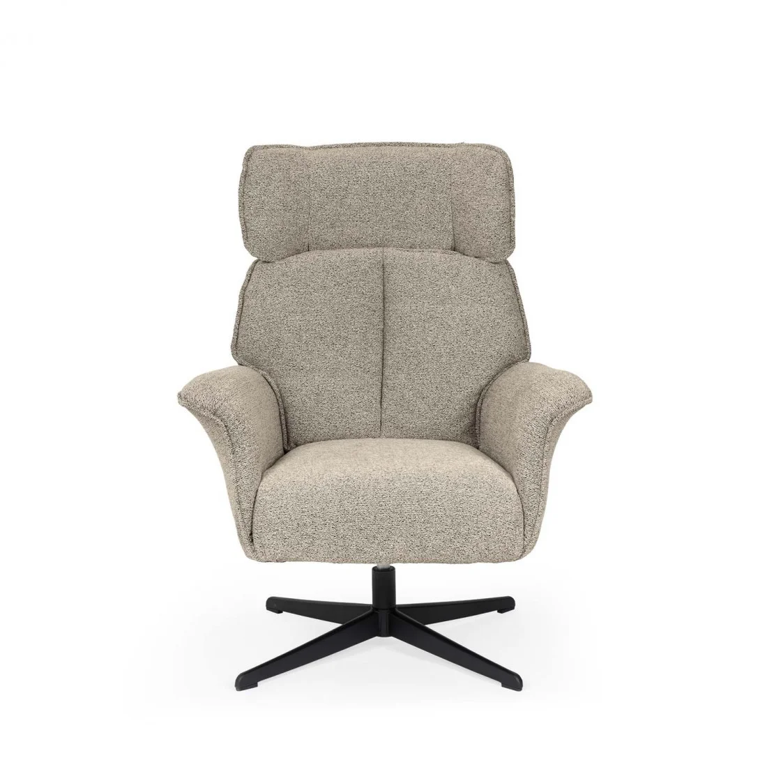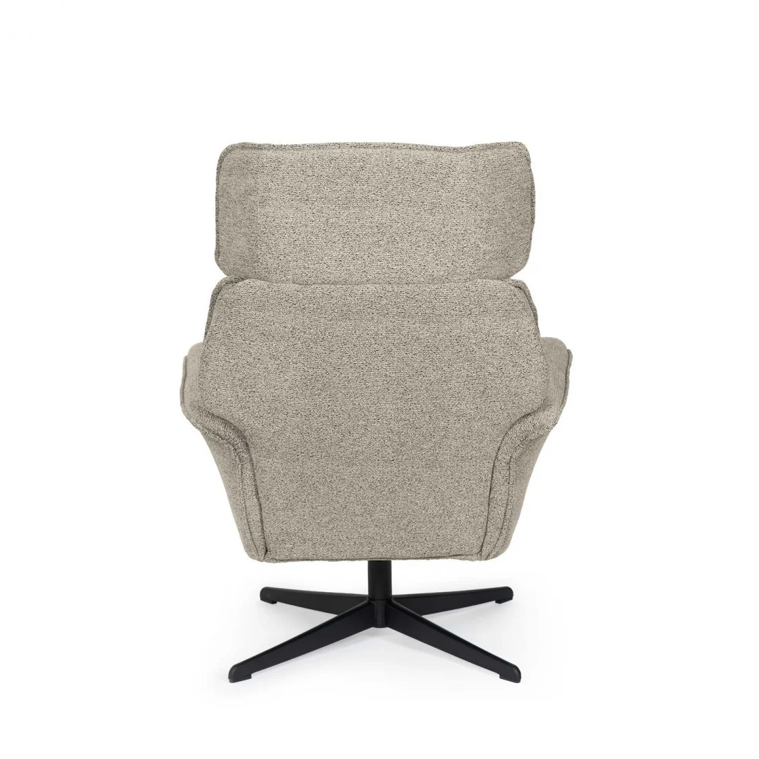 Tapizada en un tejido de textura suave y disponible en tres tonos versátiles —beige, gris y taupe—, se integra con facilidad en interiores modernos, clásicos o nórdicos. La base metálica negra, robusta y estilizada, incorpora un mecanismo giratorio de 360º que suma practicidad sin sacrificar estilo.