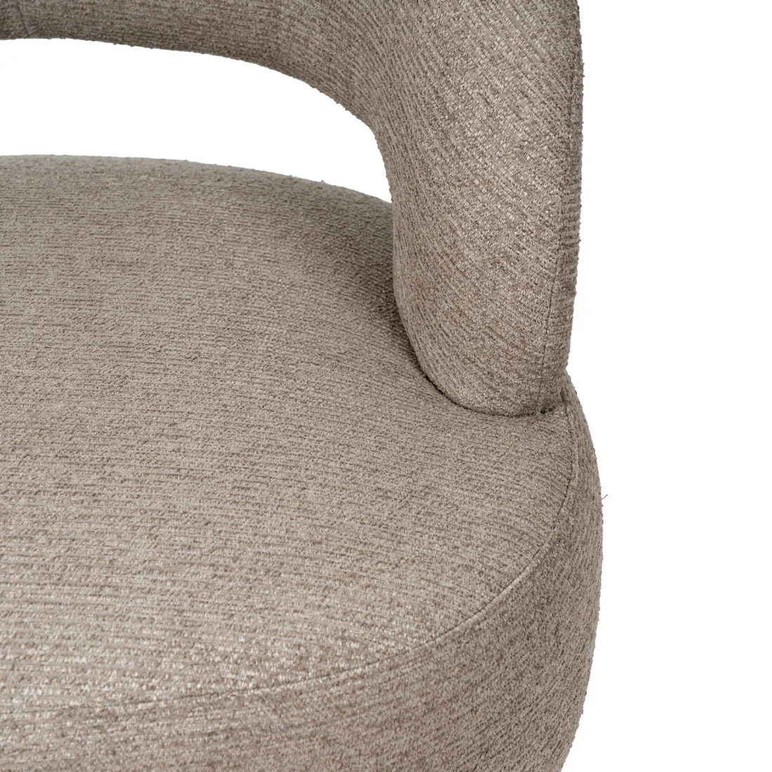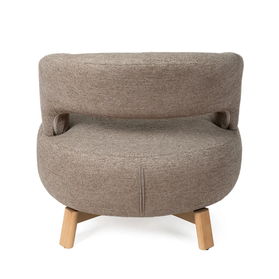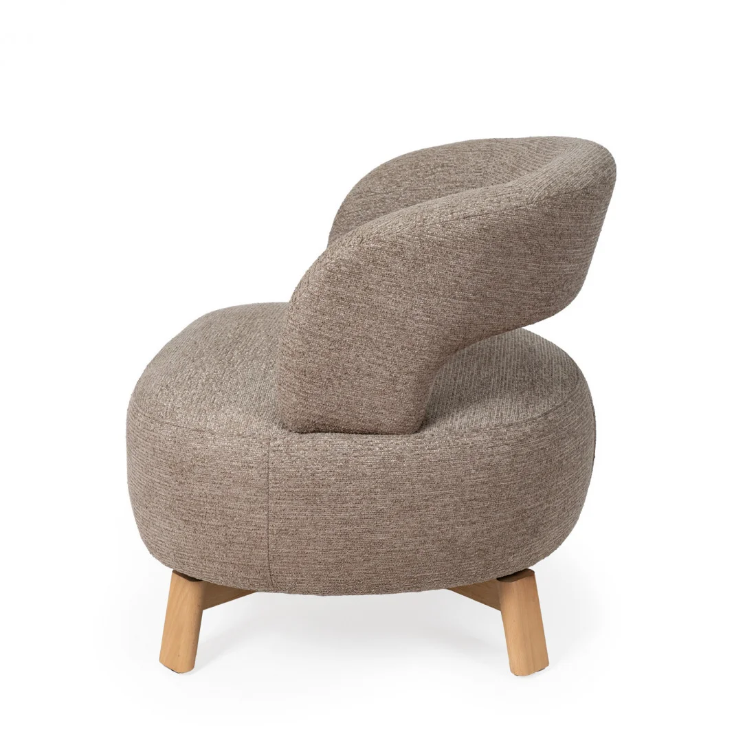 Sus patas de madera de haya elevan la estructura con un sutil contraste natural, aportando estabilidad y un toque orgánico al conjunto. Además, cuenta con un mecanismo giratorio de 360°, que añade comodidad y funcionalidad, ideal para adaptarse a distintos usos y momentos del día.
