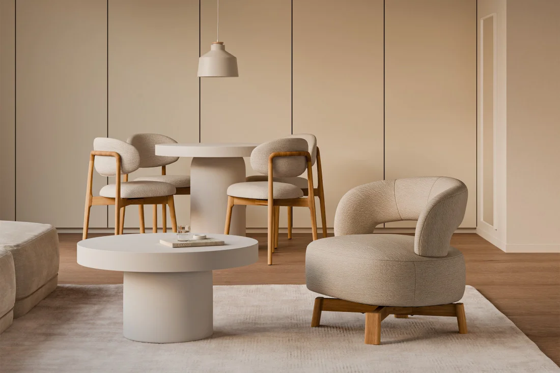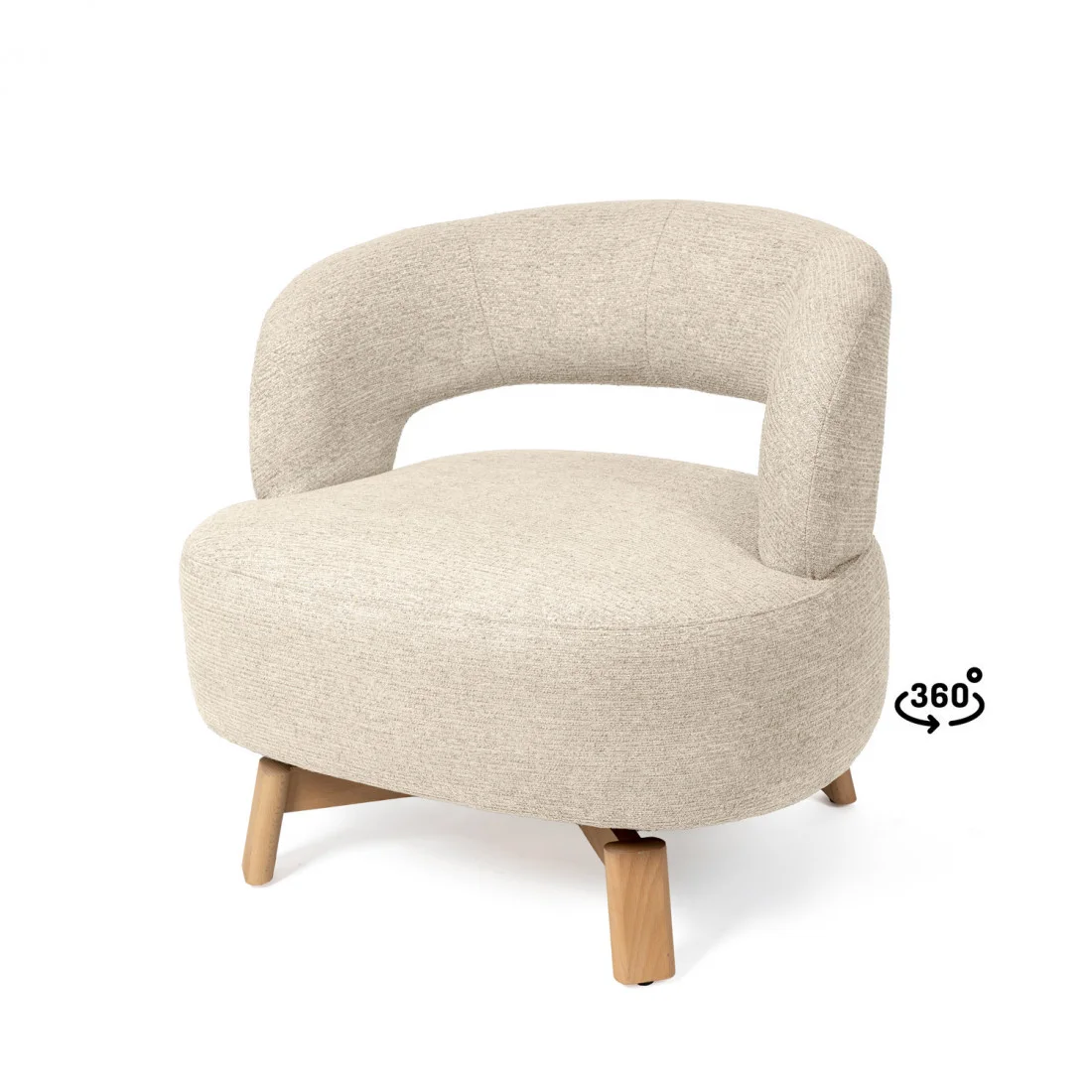Sus patas de madera de haya elevan la estructura con un sutil contraste natural, aportando estabilidad y un toque orgánico al conjunto. Además, cuenta con un mecanismo giratorio de 360°, que añade comodidad y funcionalidad, ideal para adaptarse a distintos usos y momentos del día.