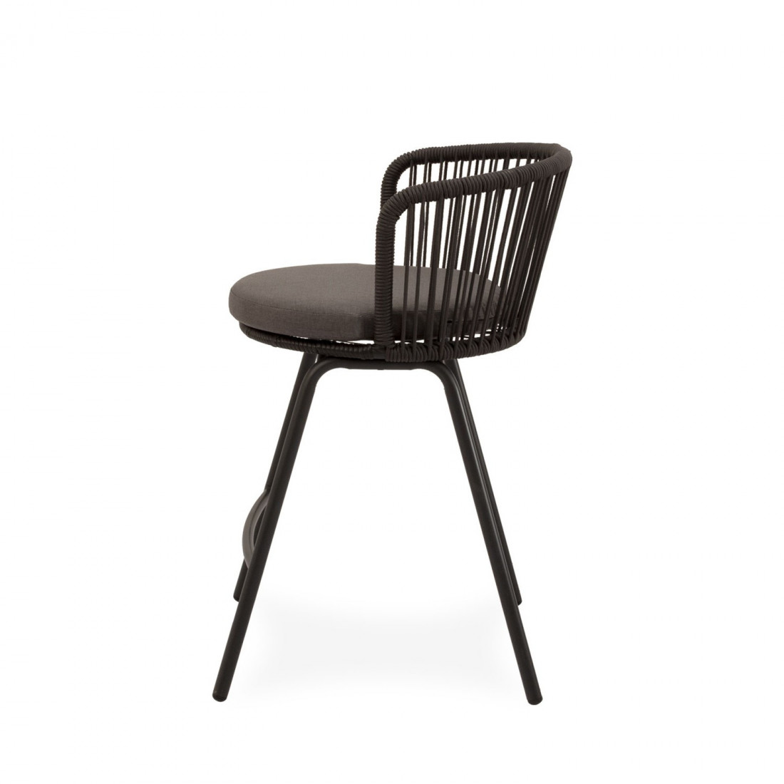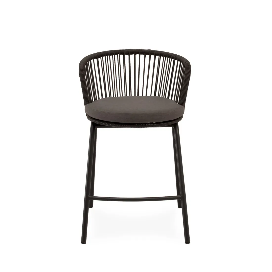El taburete PIERRE combina un estilo contemporáneo con un diseño pensado para aportar comodidad y frescura a cualquier espacio exterior. Su respaldo curvo, elaborado en cuerda resistente, presenta un entramado lineal que crea un efecto visual ligero y dinámico. Esta estructura no solo envuelve suavemente la espalda, sino que también permite una ventilación natural, perfecta para los días más cálidos.
