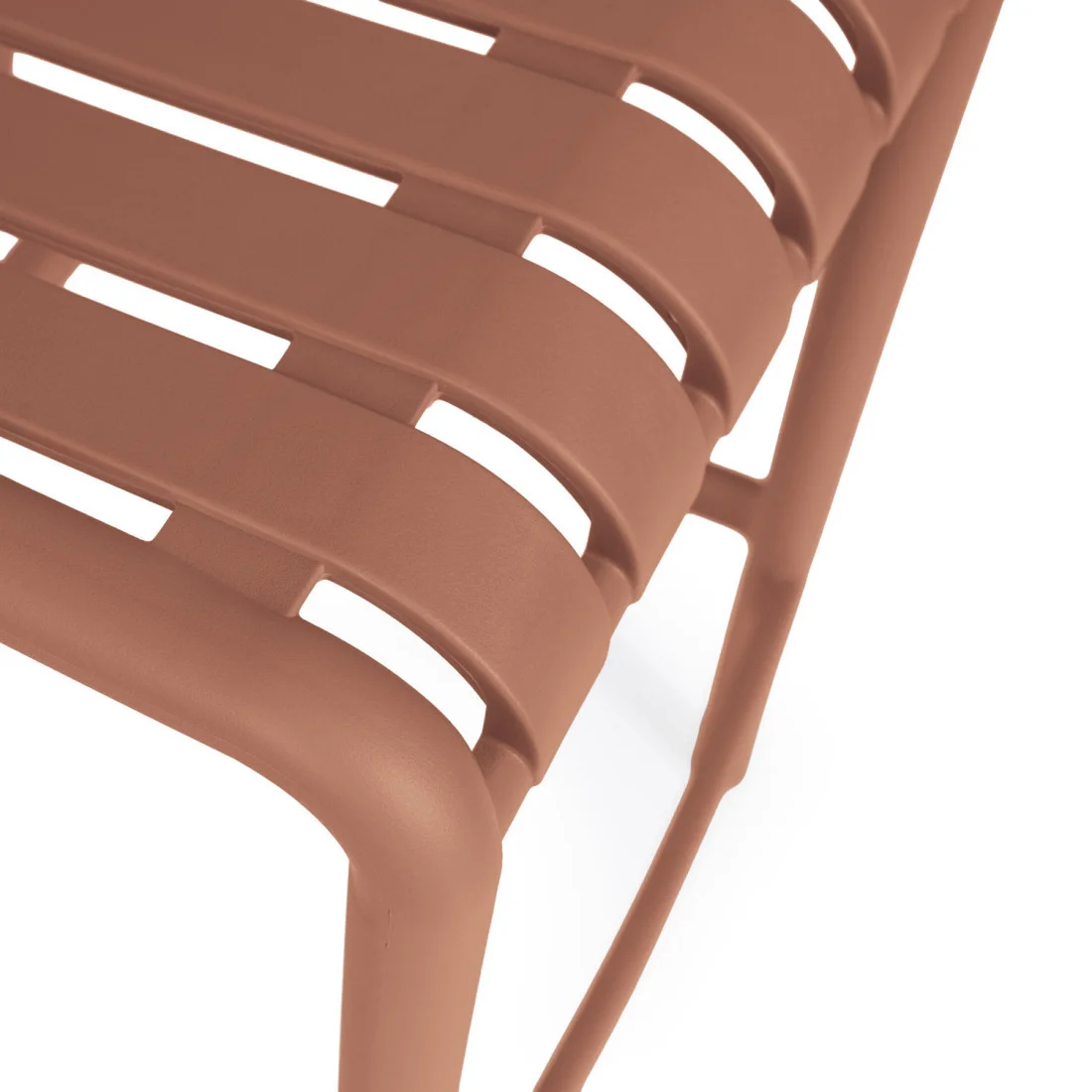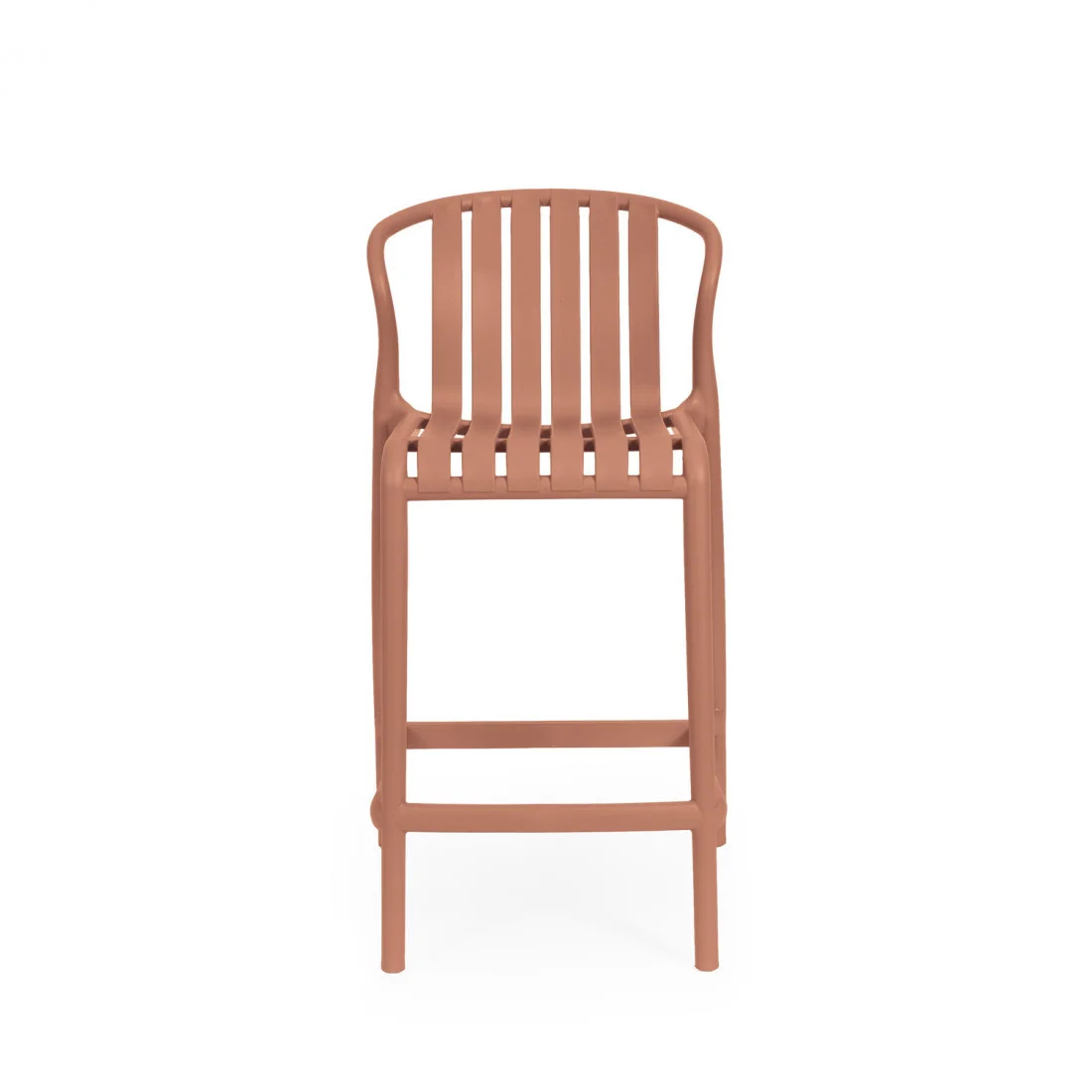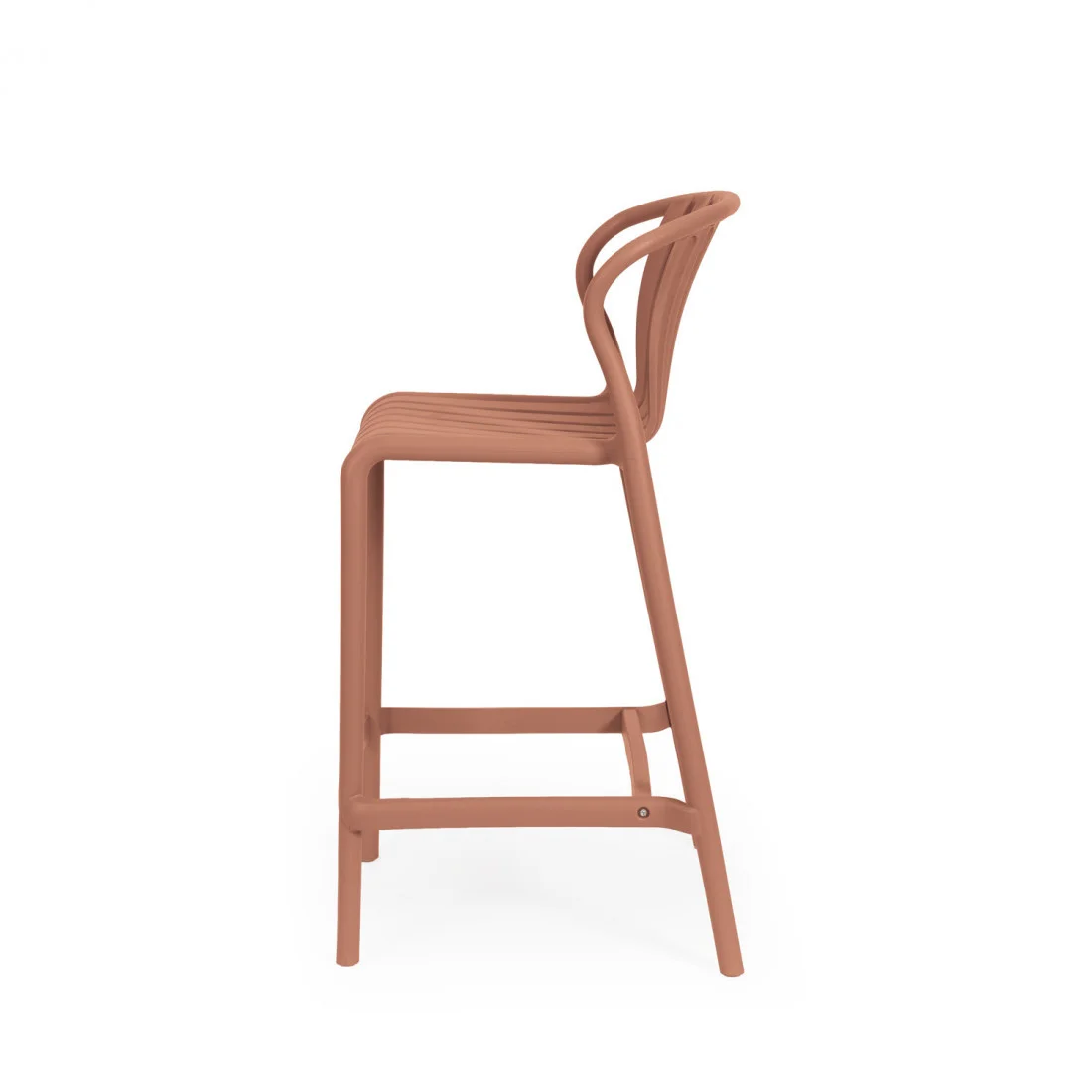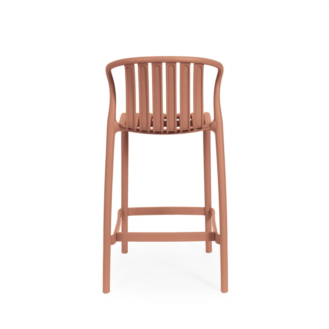 El taburete BASTIAN destaca por su diseño ligero y envolvente, fabricado en resistente polipropileno. Su asiento curvado y ergonómico, con lamas ligeramente separadas, favorece la ventilación y la comodidad incluso en usos prolongados. El respaldo, de líneas suaves y continuidad fluida con la estructura, ofrece un soporte firme sin sacrificar ligereza visual.