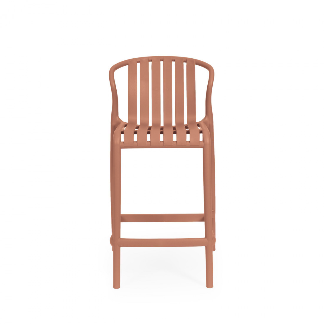 El taburete bajo PEYTON destaca por su diseño original, con un respaldo abierto compuesto por pequeñas barras verticales y un asiento de polipropileno en color beige, todo en una misma pieza.