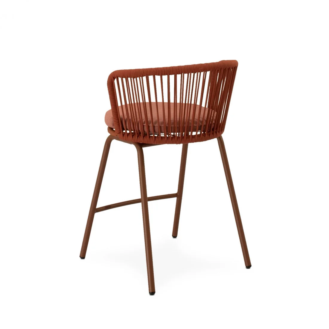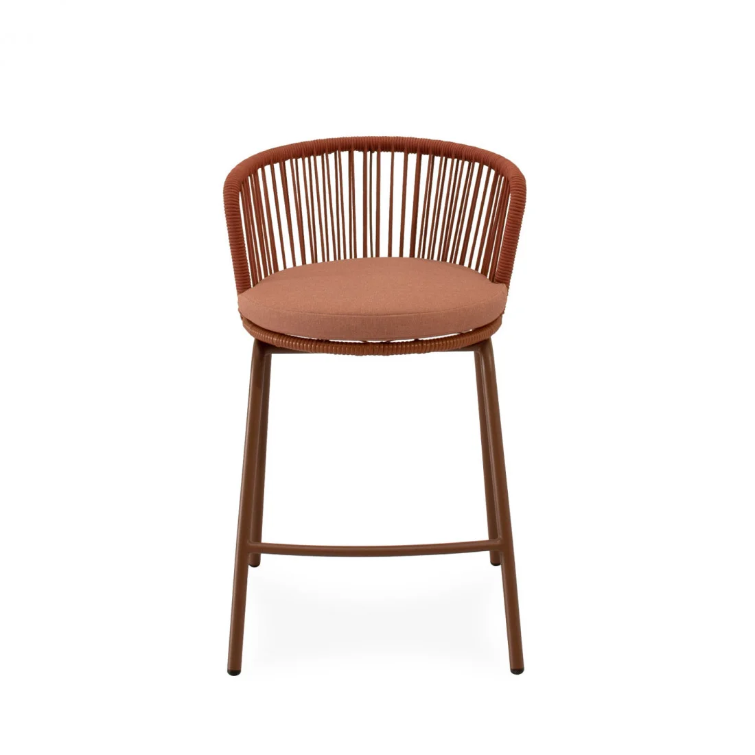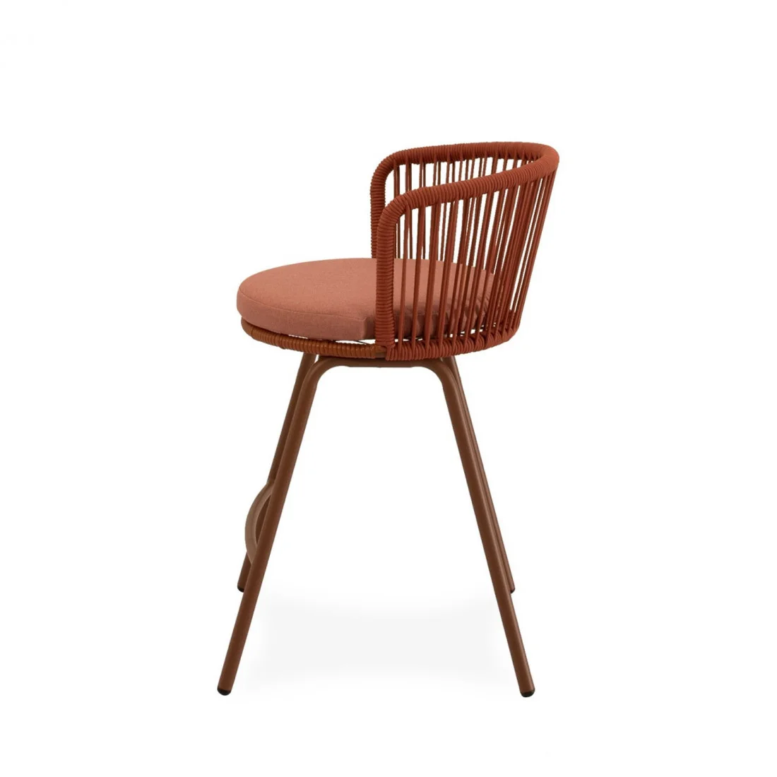 El taburete PIERRE combina un estilo contemporáneo con un diseño pensado para aportar comodidad y frescura a cualquier espacio exterior. Su respaldo curvo, elaborado en cuerda resistente, presenta un entramado lineal que crea un efecto visual ligero y dinámico. Esta estructura no solo envuelve suavemente la espalda, sino que también permite una ventilación natural, perfecta para los días más cálidos.