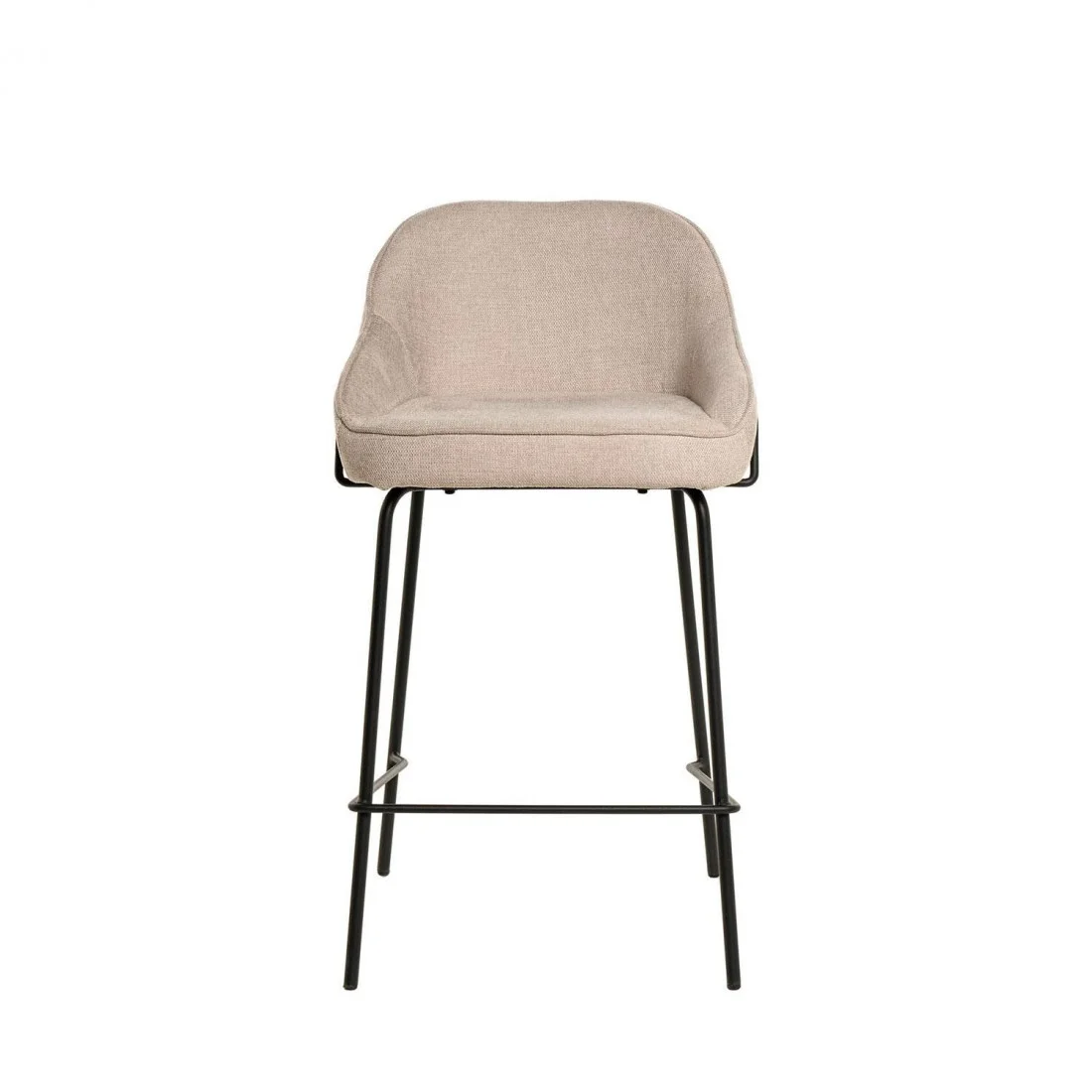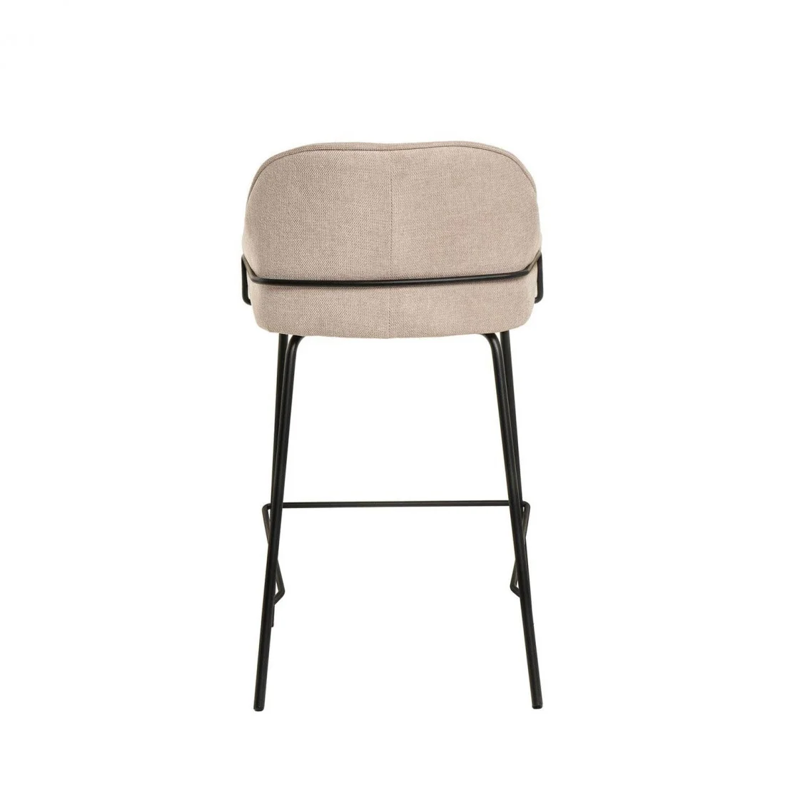 Tapizado en un elegante beige de poliéster 100%, y con patas y barras traseras/laterales de metal negro, este taburete destaca por su diseño sofisticado, ideal para entornos modernos.