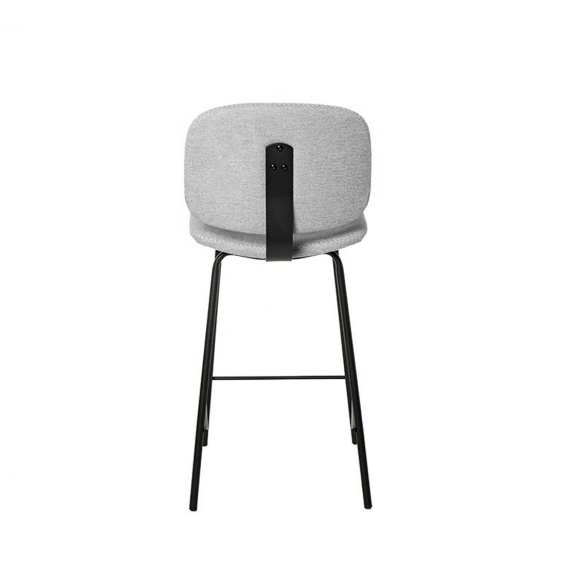 El taburete LOGAN está tapizado en tela color gris de poliéster 100%, que contrasta elegantemente con su estructura metálica negra.