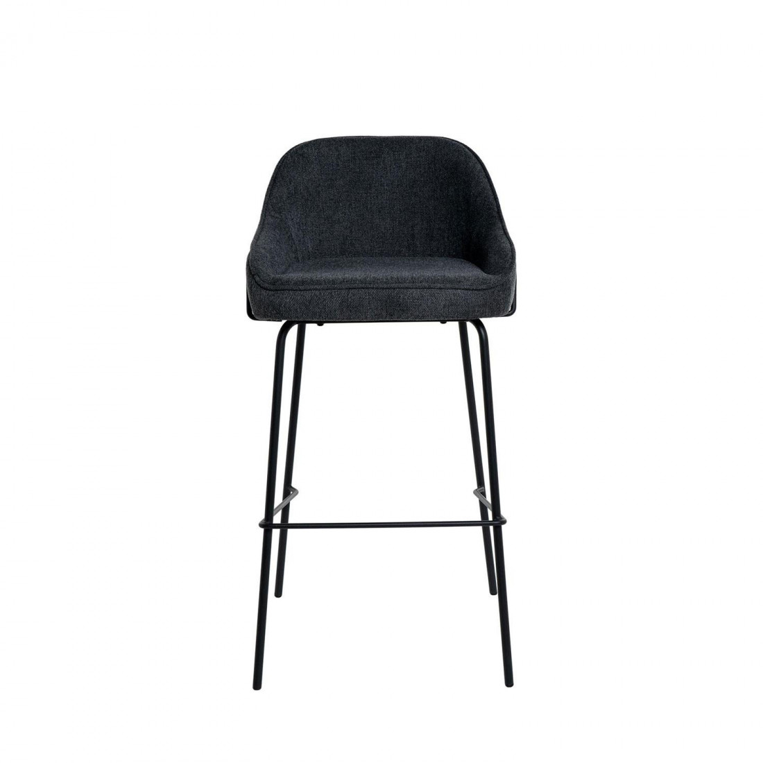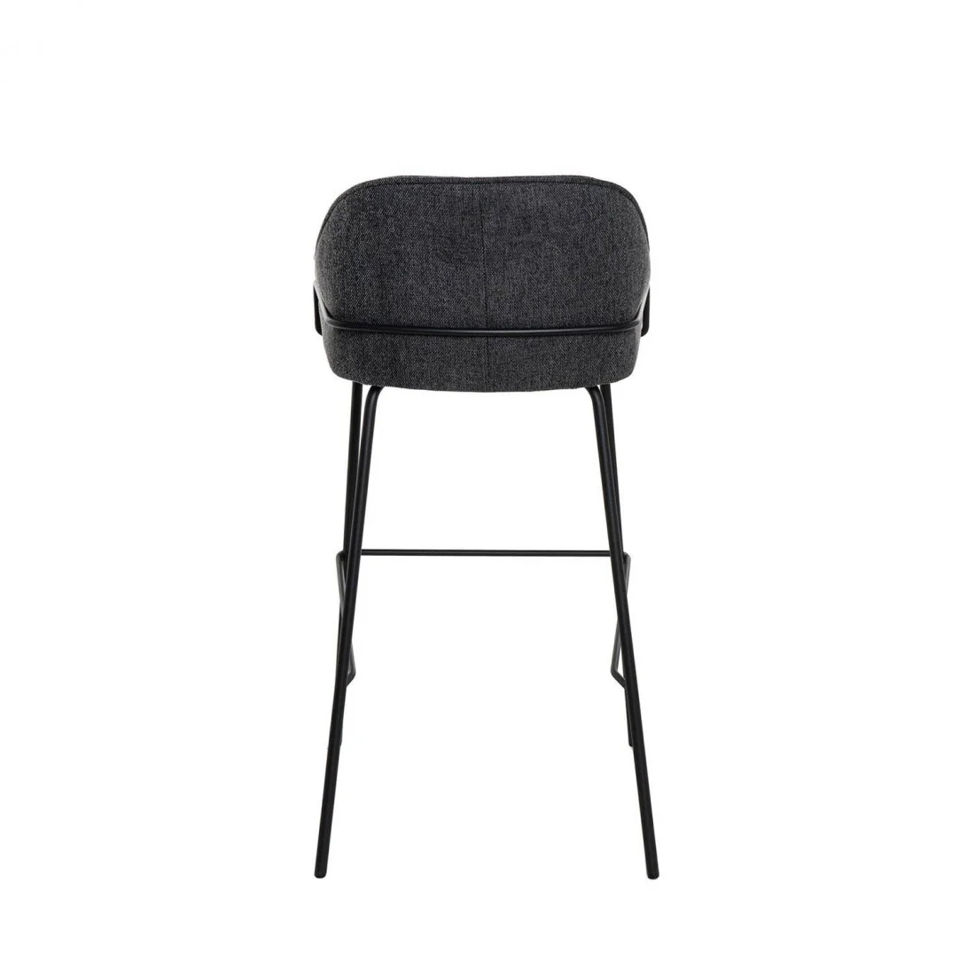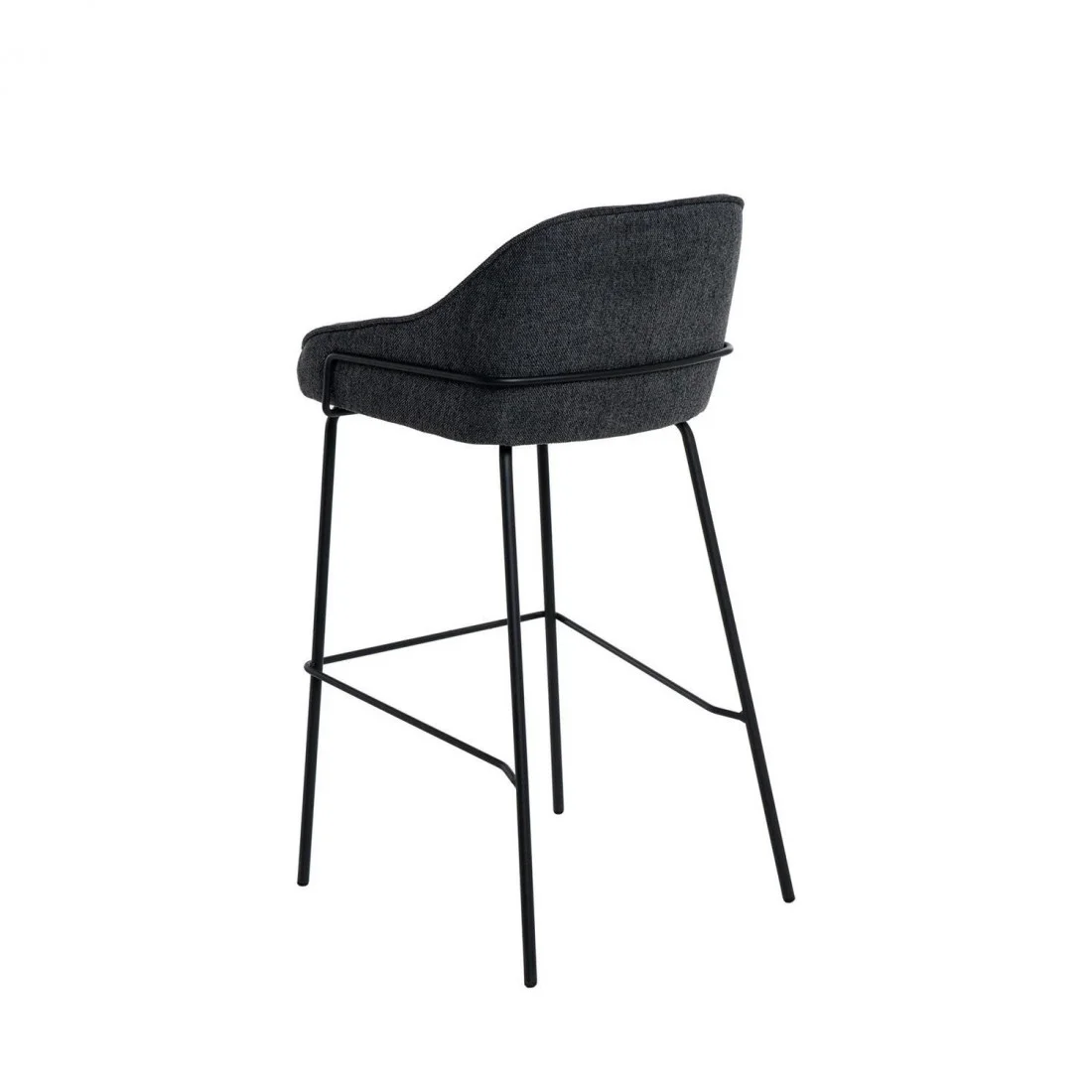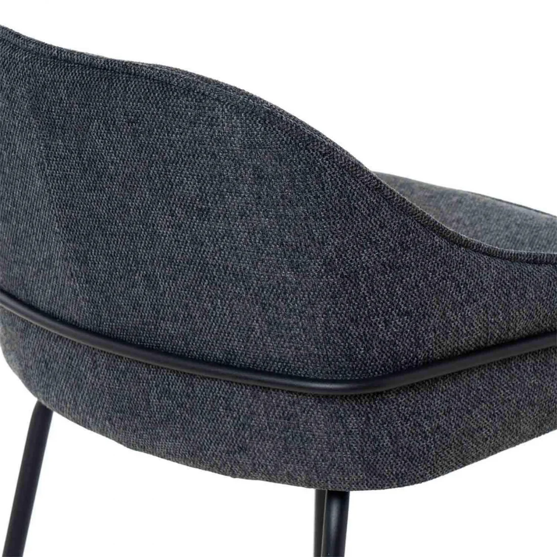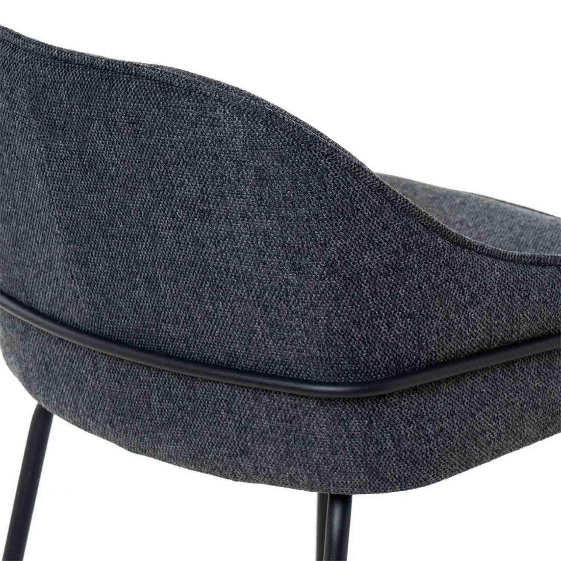 El asiento está tapizado en tela de color gris oscuro (100% poliéster), proporcionando un tono neutro y sofisticado. La estructura y las patas de metal añaden un toque moderno y resistente.