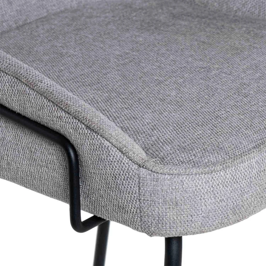 Su estructura está compuesta por patas de metal y un tapizado de tela en color beige (100% poliéster), con una ligera curvatura en el respaldo que proporciona mayor comodidad.