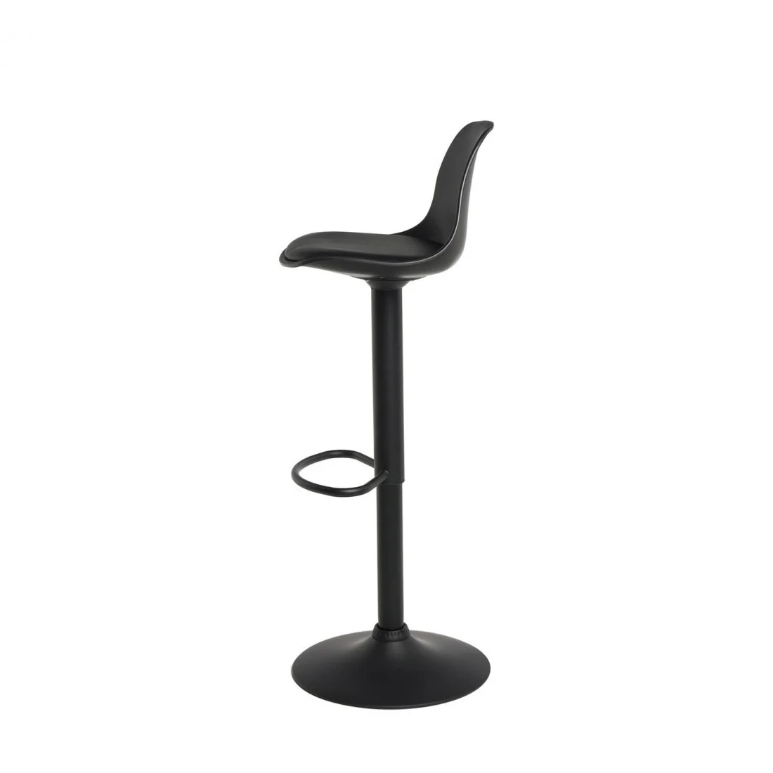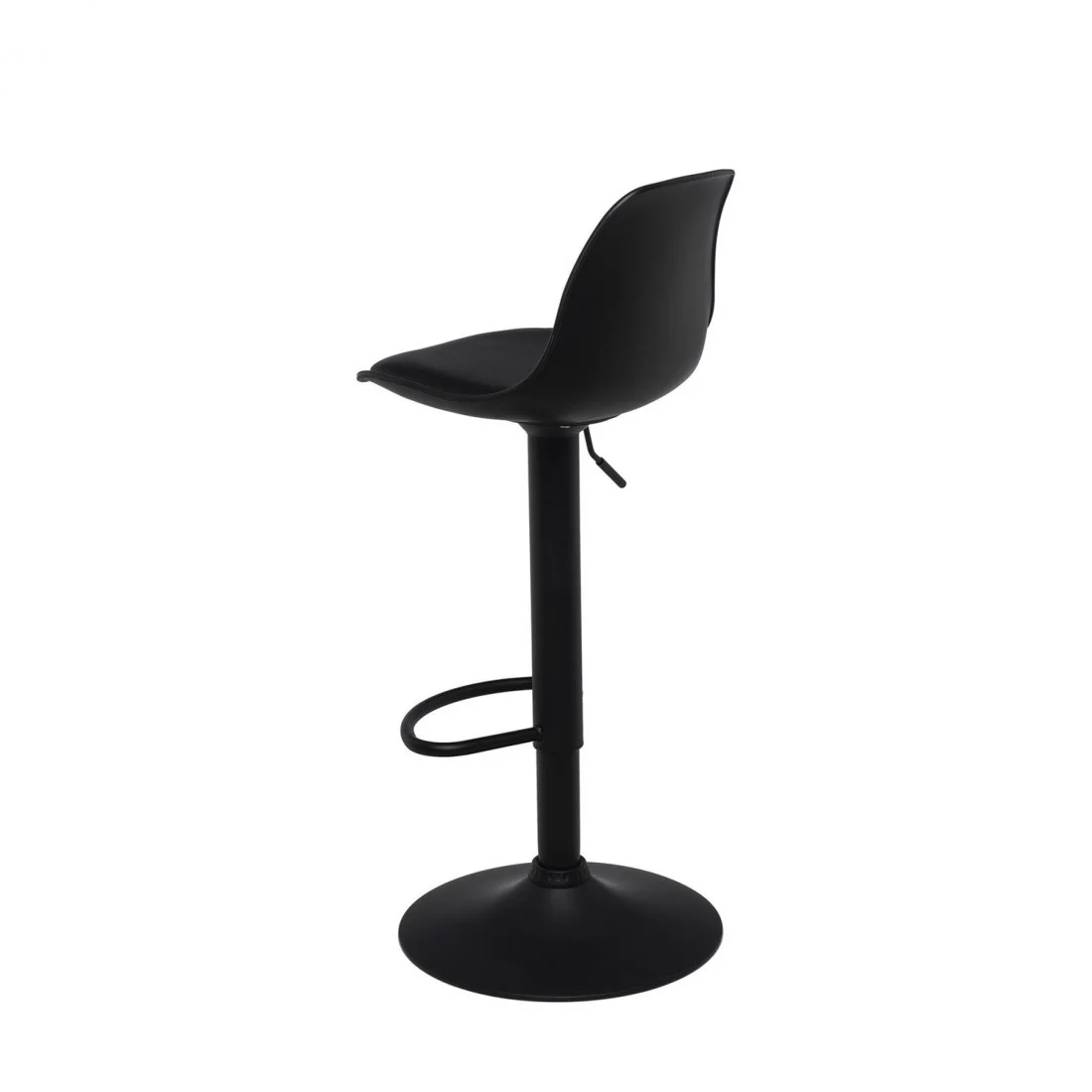 La estructura metálica en color negro, combinada con un reposapiés delantero y una base circular, le confiere un aspecto elegante y moderno.
