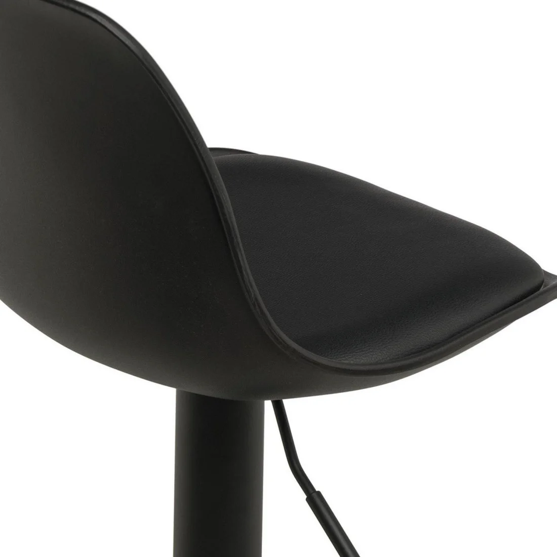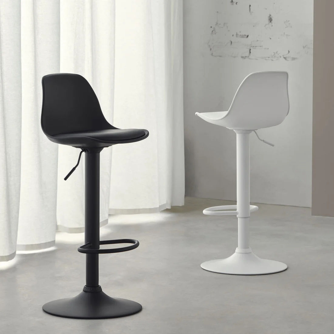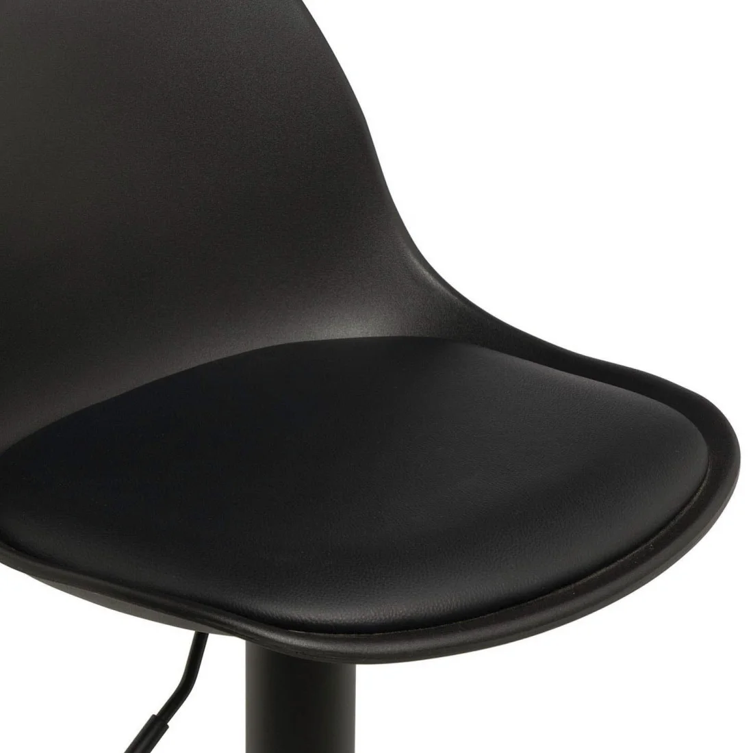 Taburete compuesto por un asiento acolchado y respaldo de polipropileno cóncavo, diseñado para ofrecer comodidad en el uso diario.