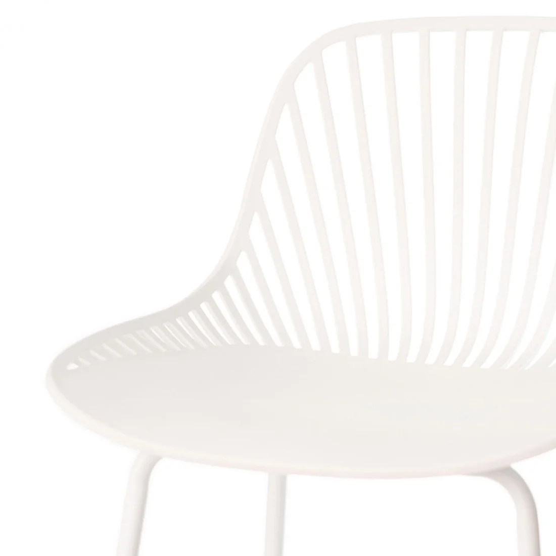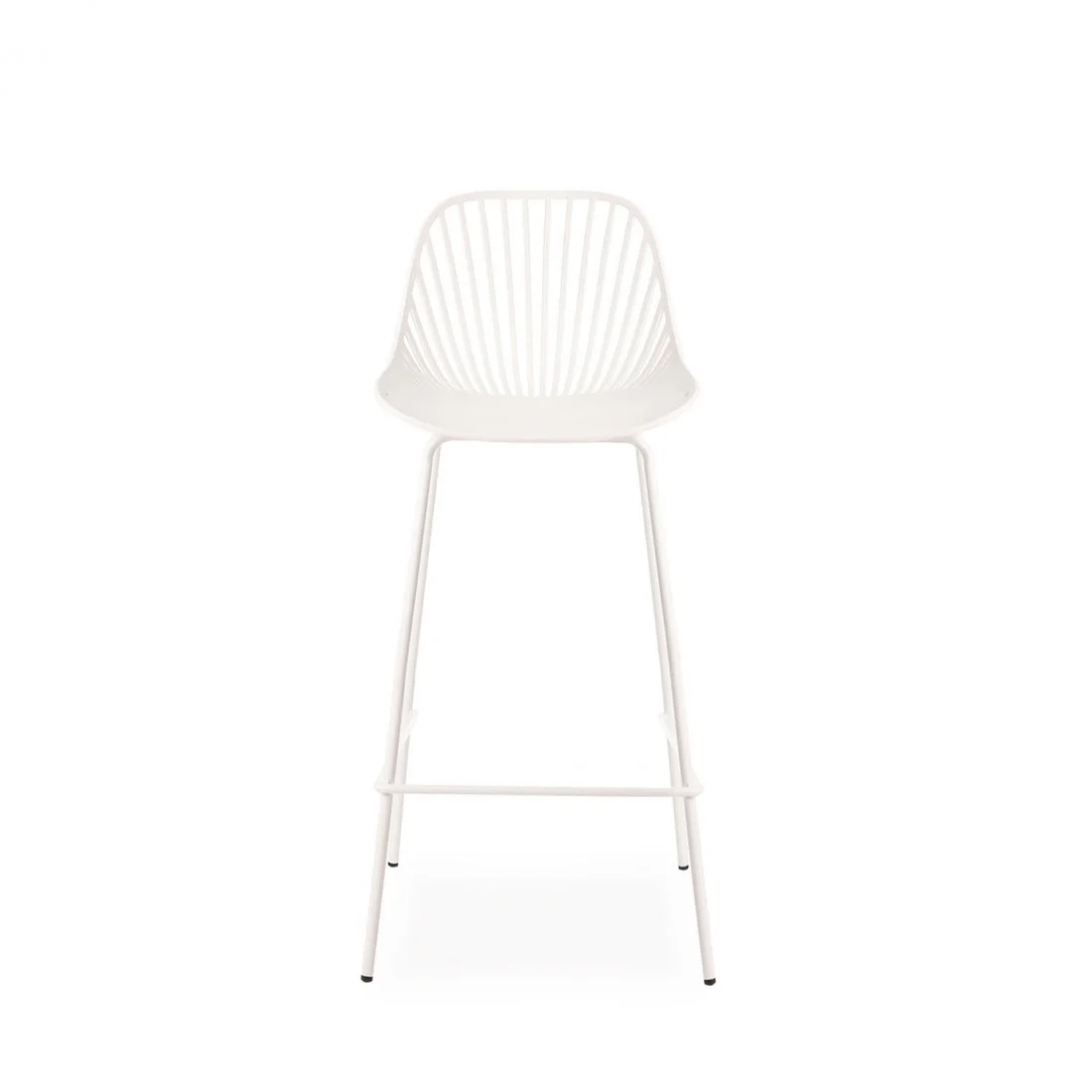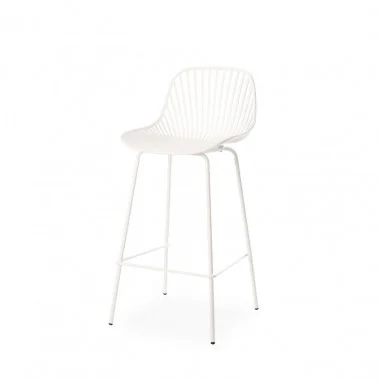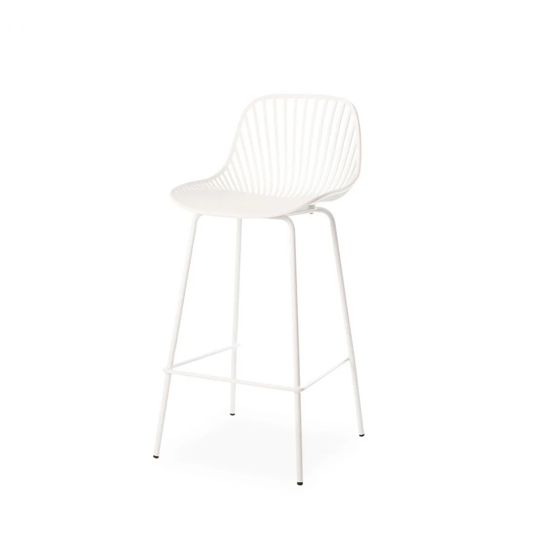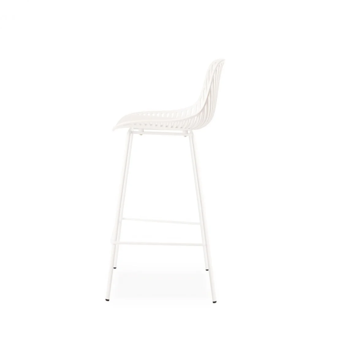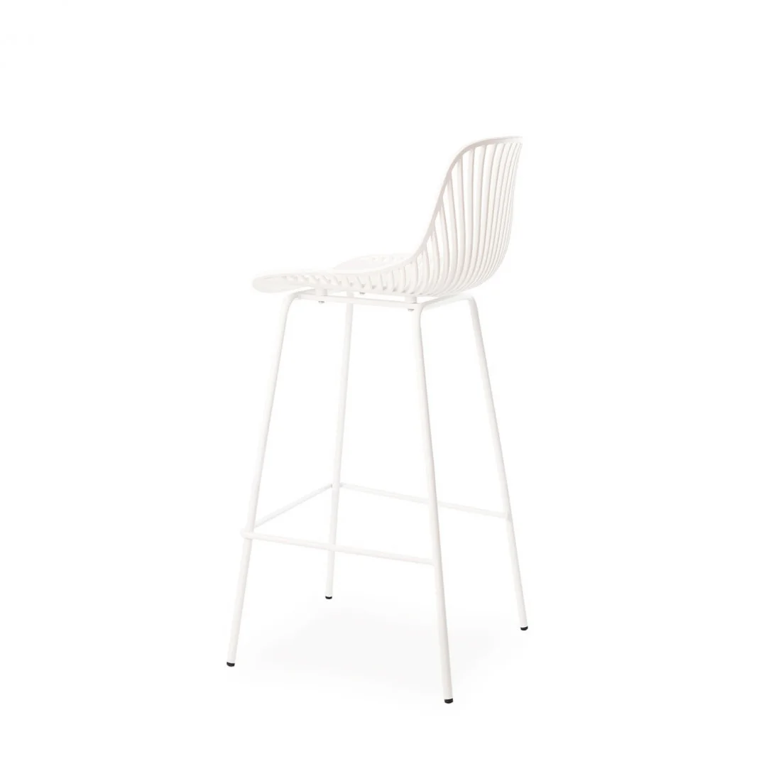 El taburete bajo PEYTON destaca por su diseño original, con un respaldo abierto compuesto por pequeñas barras verticales y un asiento de polipropileno en color blanco, todo en una misma pieza.