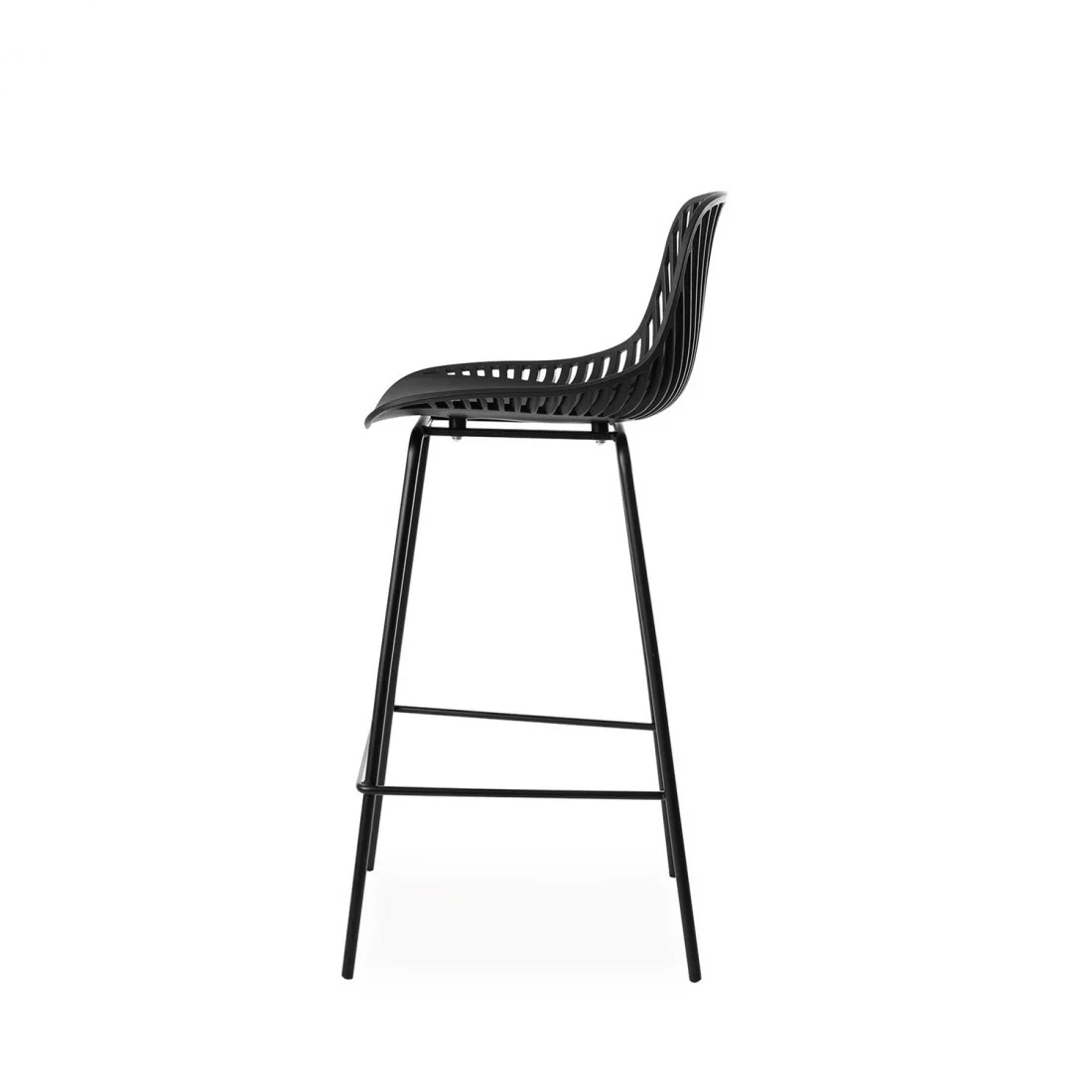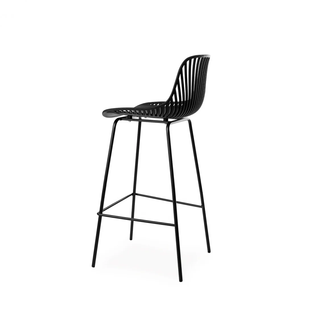 El taburete bajo PEYTON destaca por su diseño original, con un respaldo abierto compuesto por pequeñas barras verticales y un asiento de polipropileno en color blanco, todo en una misma pieza.