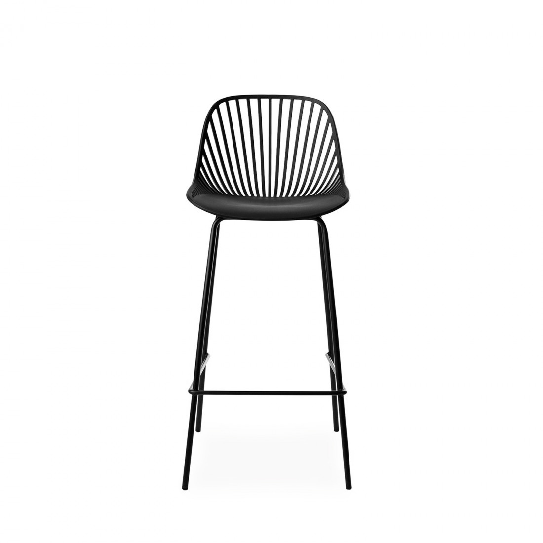 El taburete bajo PEYTON destaca por su diseño original, con un respaldo abierto compuesto por pequeñas barras verticales y un asiento de polipropileno en color beige, todo en una misma pieza.