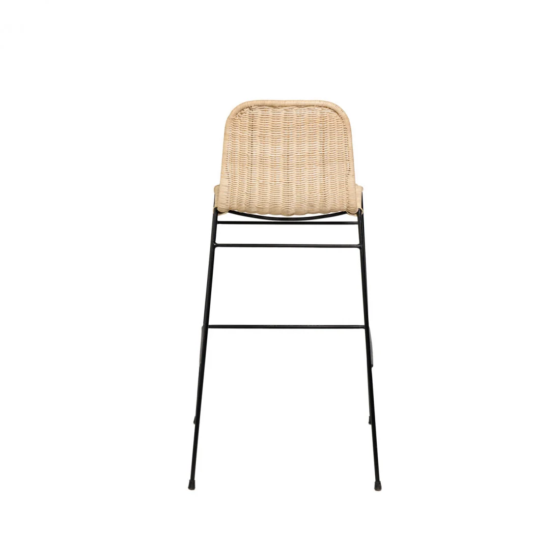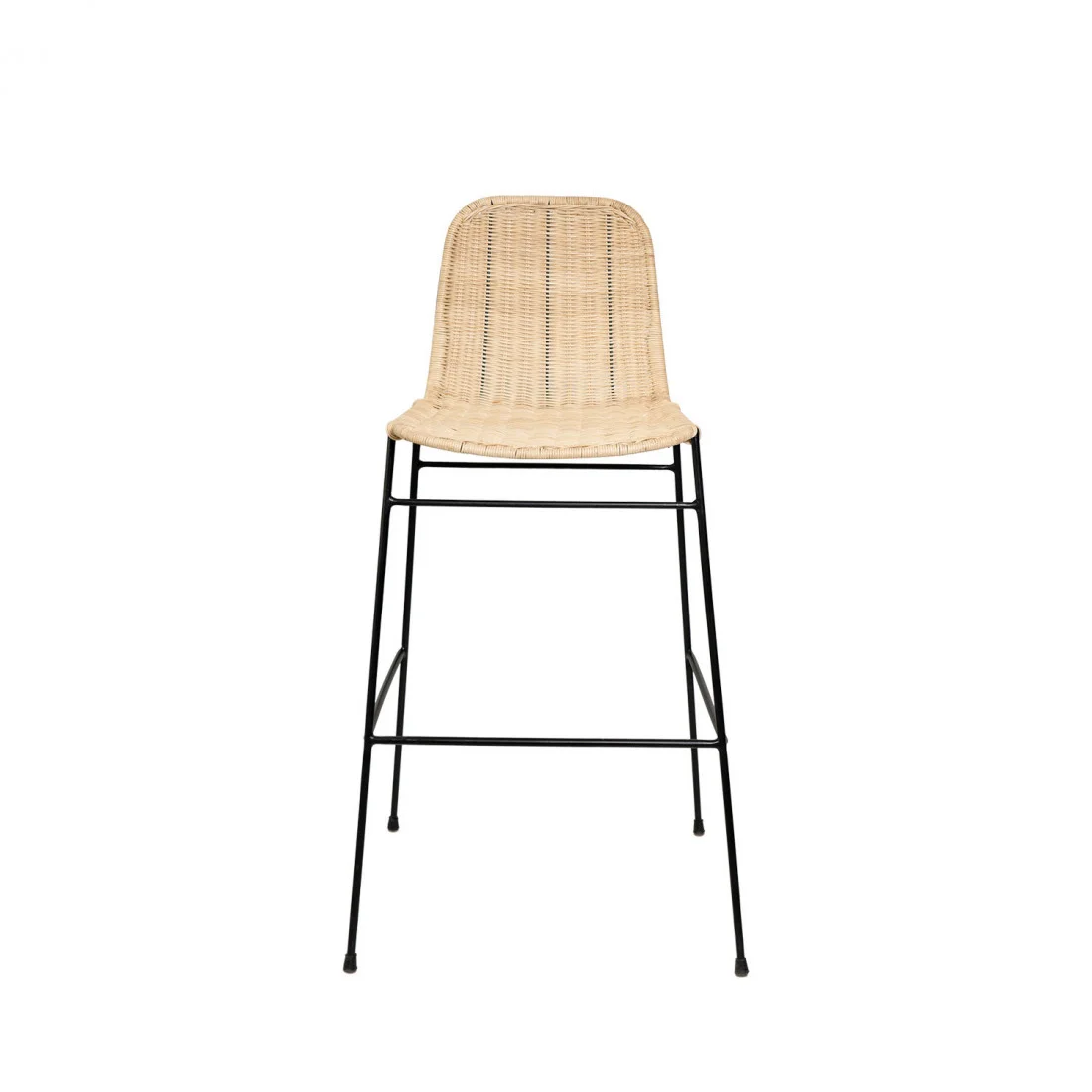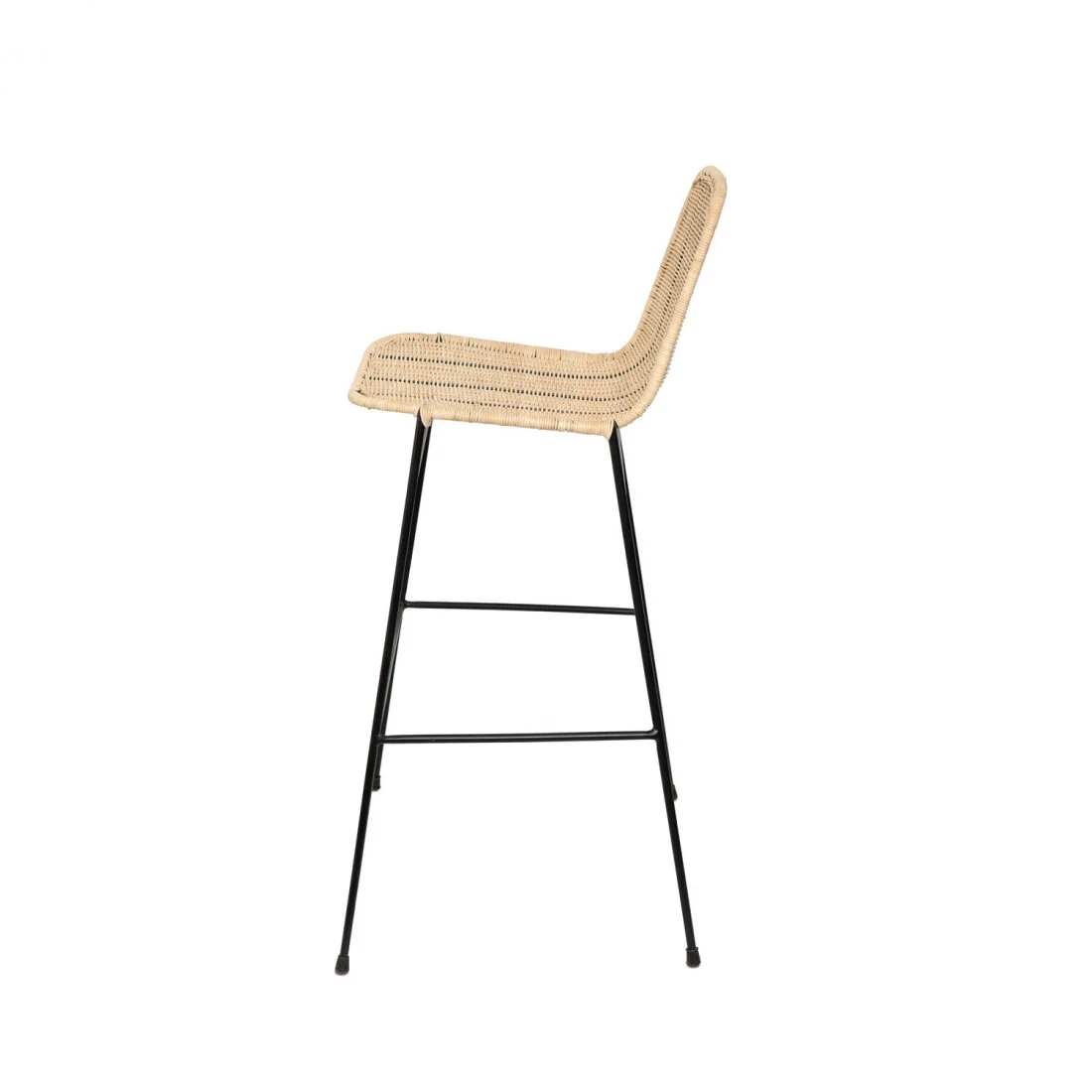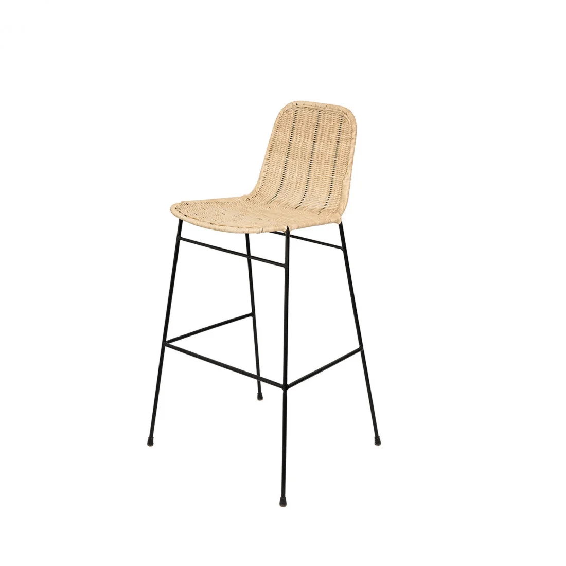 El taburete CARLO se distingue por su elegancia y diseño sofisticado, combinando a la perfección la calidez del ratán natural con la solidez de unas estilizadas patas de hierro en color negro.