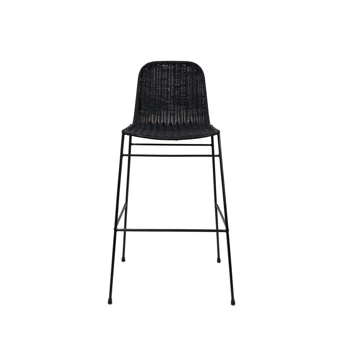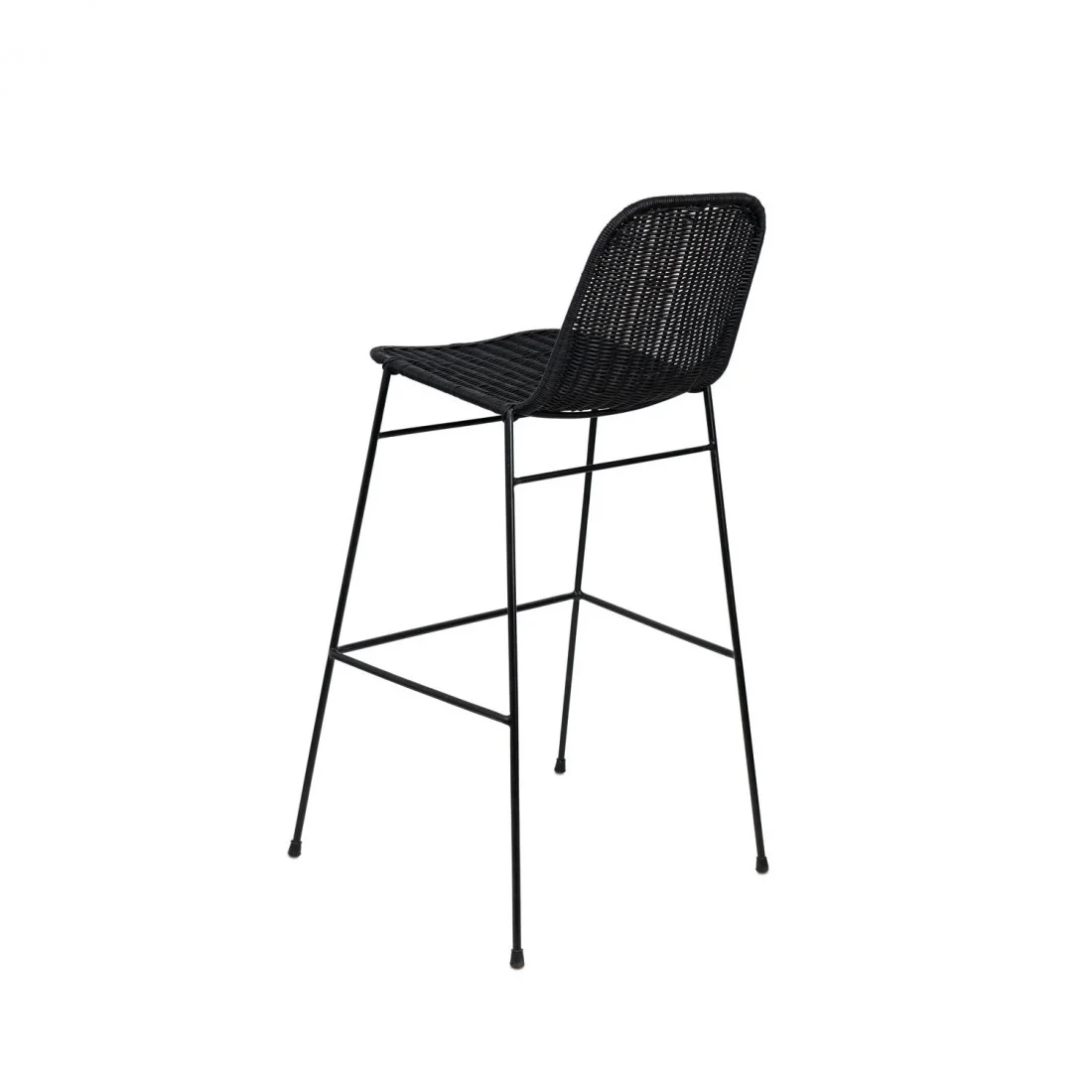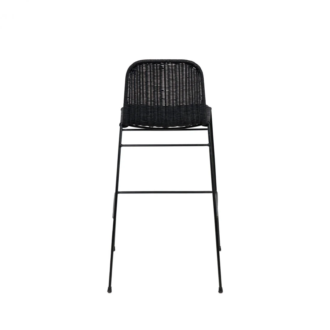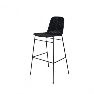 El taburete CARLO destaca por su elegancia y diseño sofisticado, gracias a su acabado completamente en negro, que abarca tanto su estructura de ratán como sus resistentes patas de hierro.
