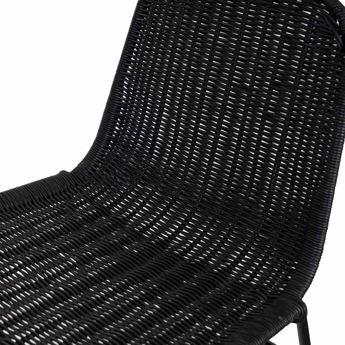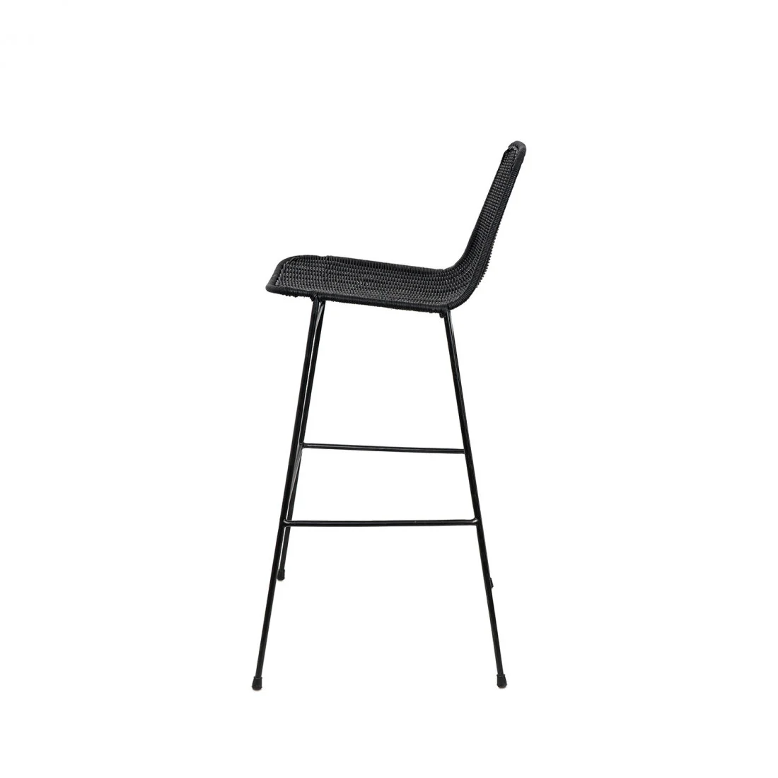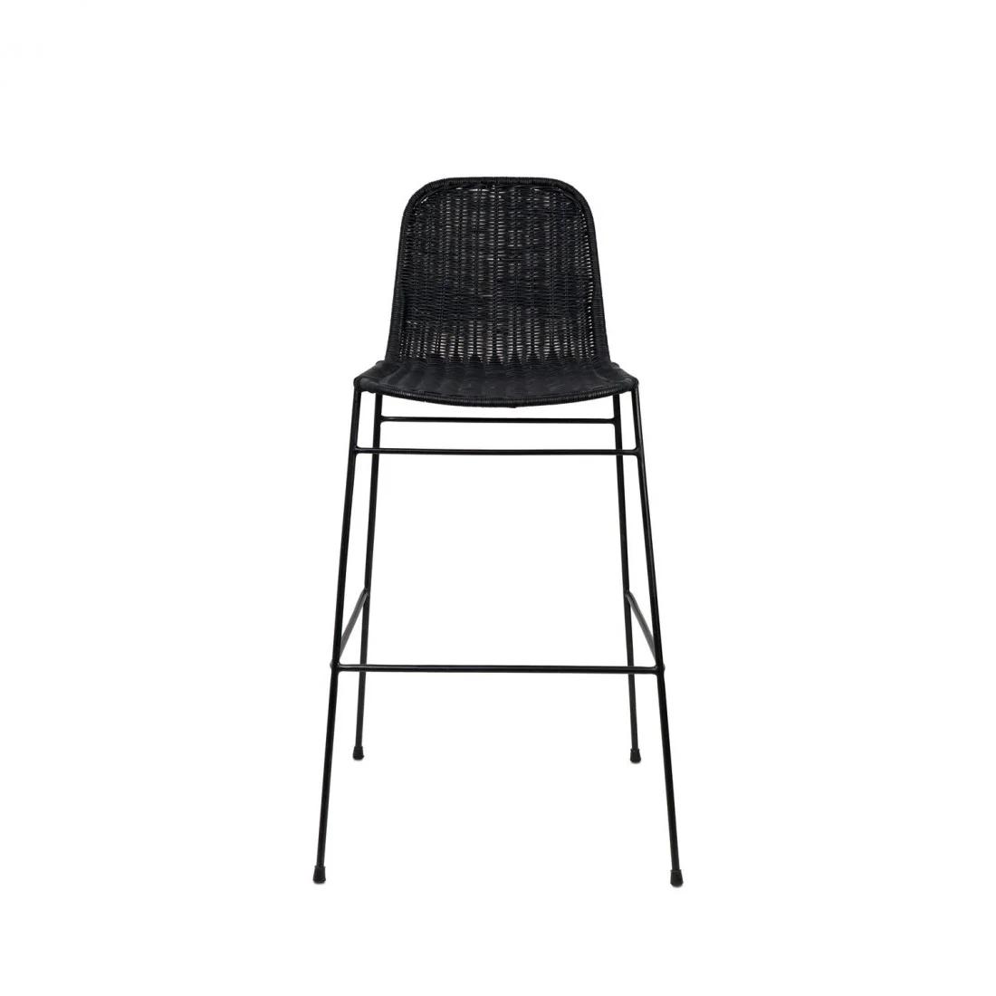 El taburete CARLO destaca por su elegancia y diseño sofisticado, gracias a su acabado completamente en negro, que abarca tanto su estructura de ratán como sus resistentes patas de hierro.