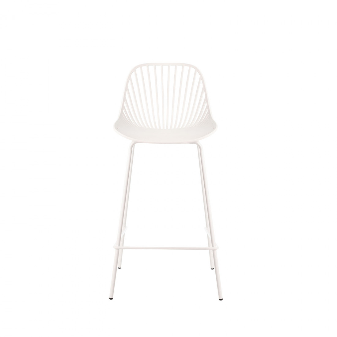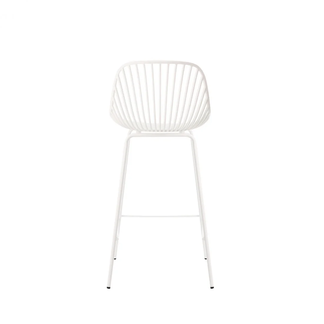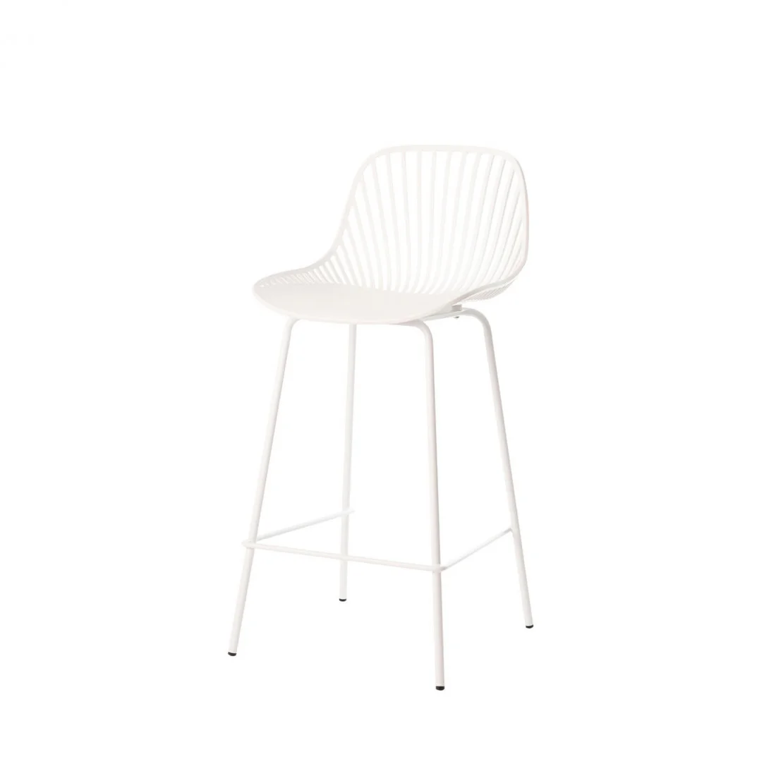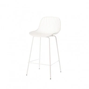 El taburete bajo PEYTON destaca por su diseño original, con un respaldo abierto compuesto por pequeñas barras verticales y un asiento de polipropileno en color blanco, todo en una misma pieza.