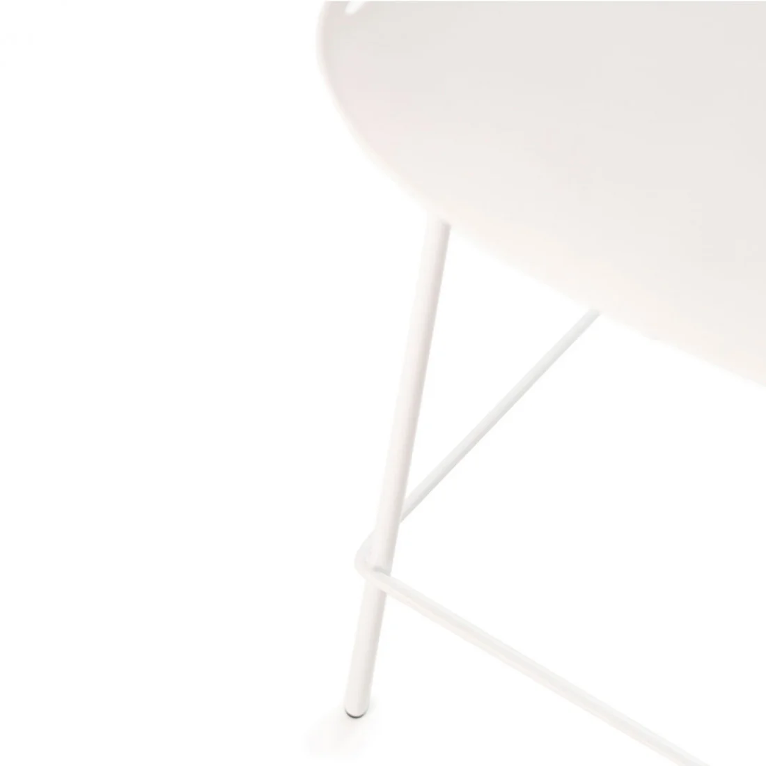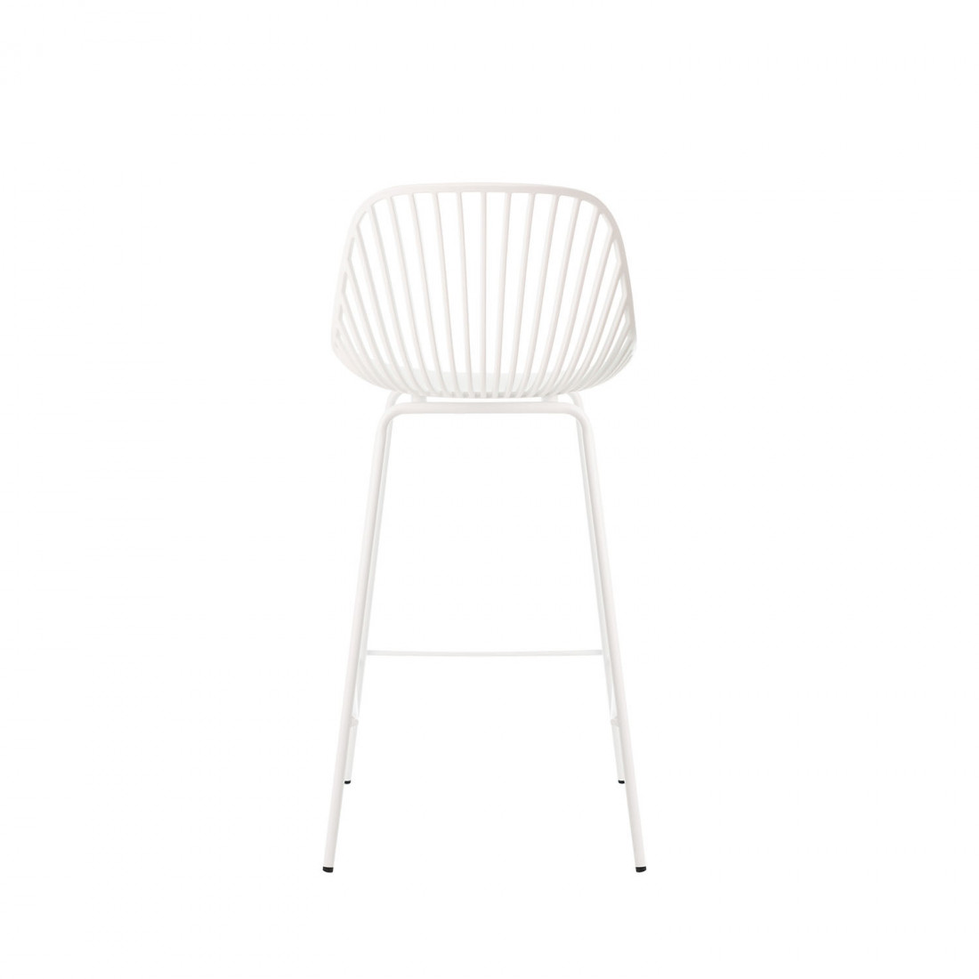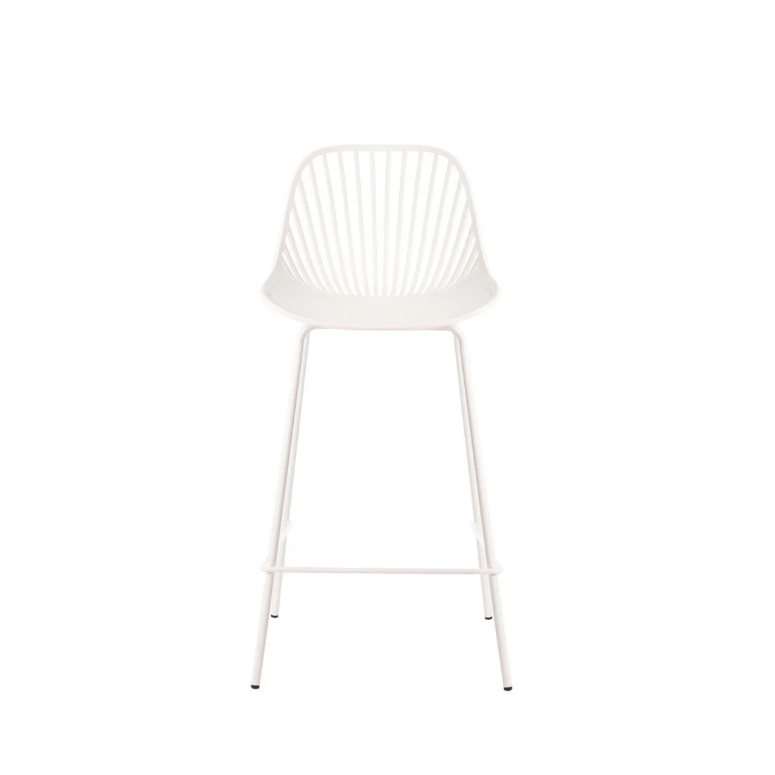 El taburete bajo PEYTON destaca por su diseño original, con un respaldo abierto compuesto por pequeñas barras verticales y un asiento de polipropileno en color blanco, todo en una misma pieza.