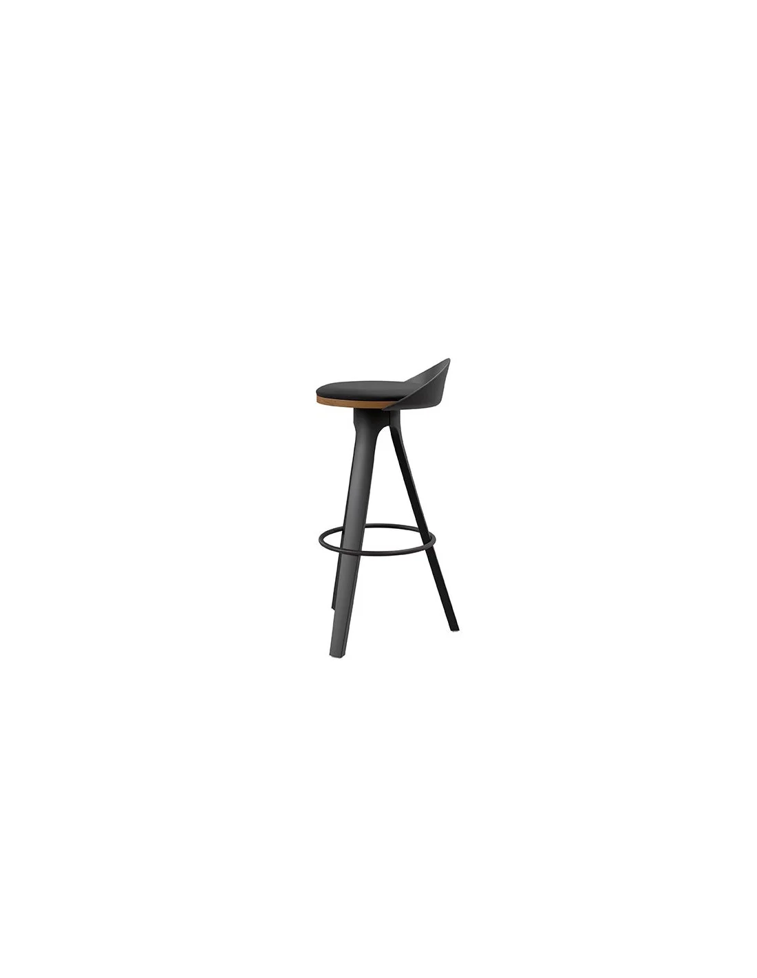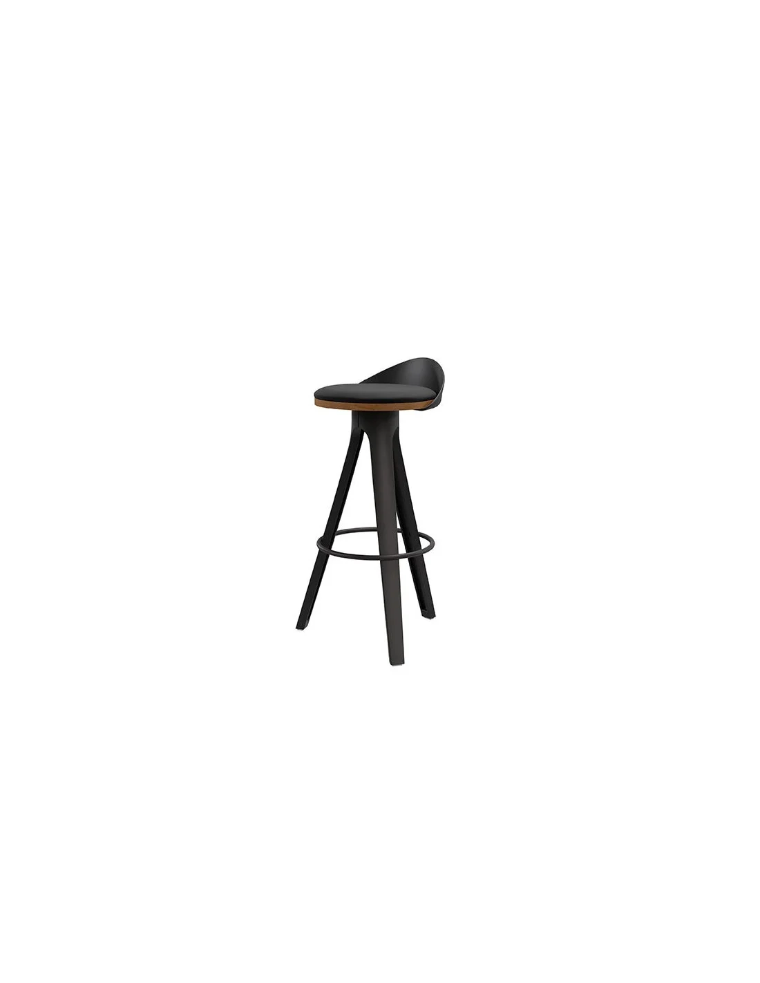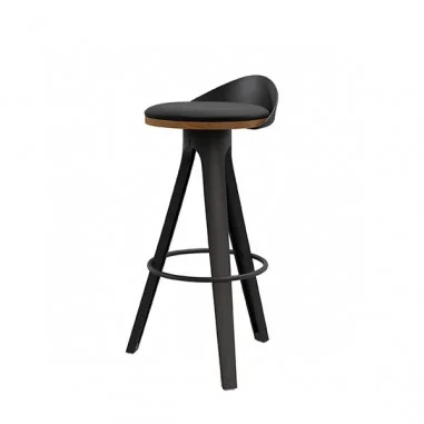 Además, cuenta con un reposapiés circular y patas de polipropileno en color negro cuya combinación con el tono natural de la madera hace que este taburete sea visualmente atractivo y versátil, adaptándose a diversos estilos de interiores.