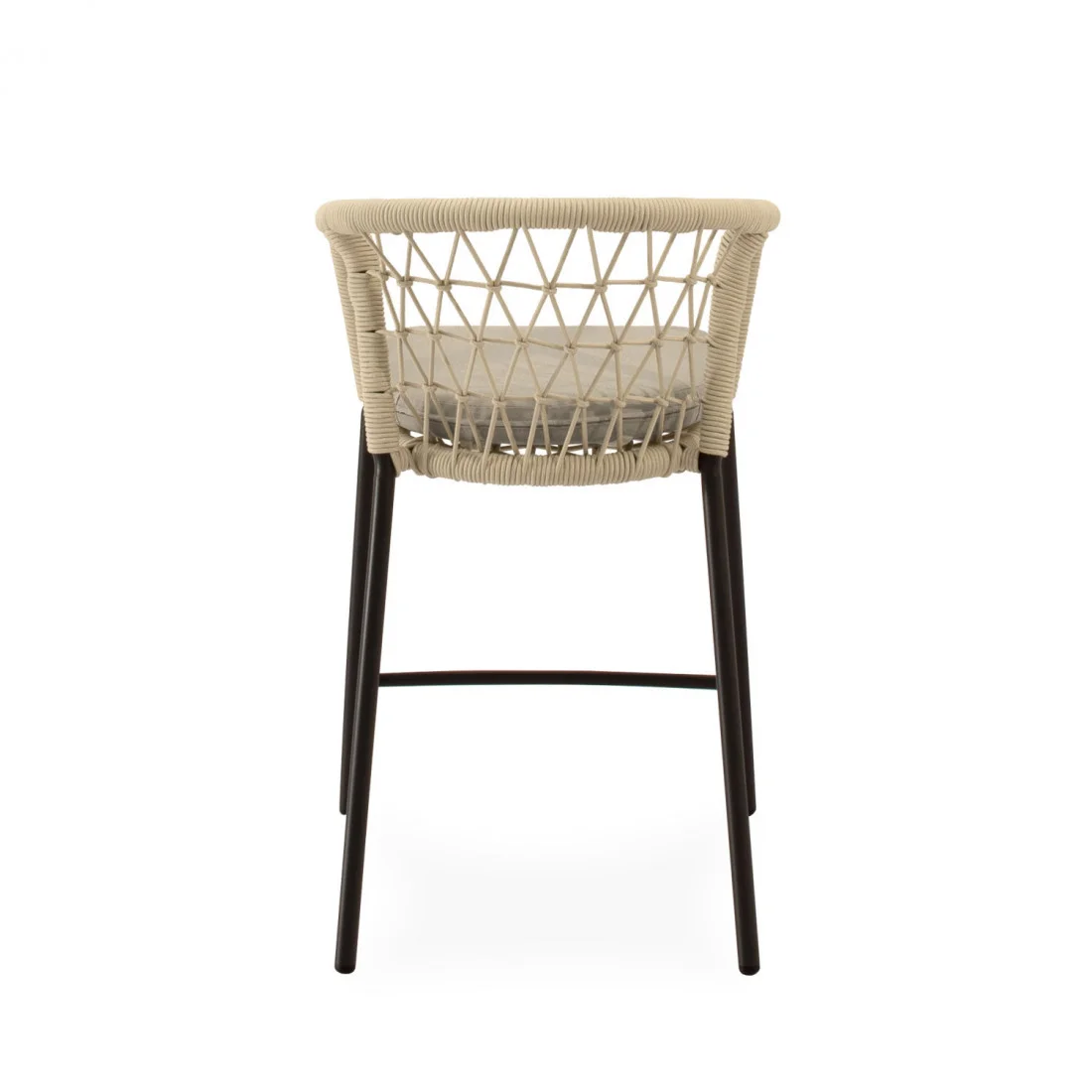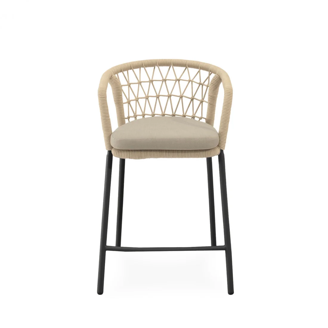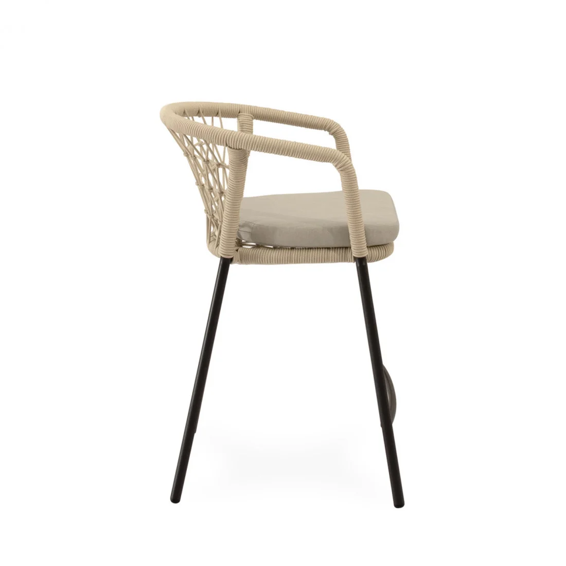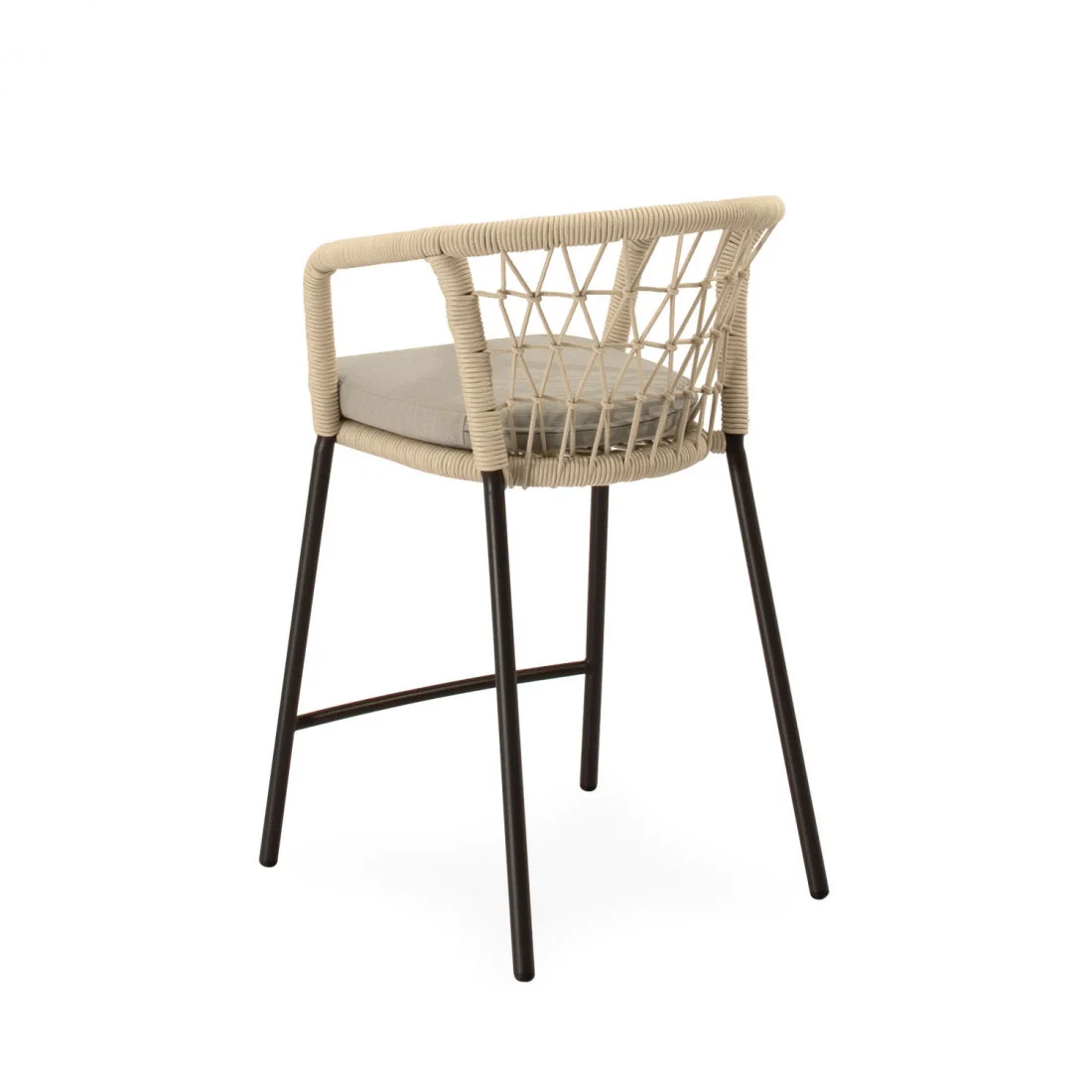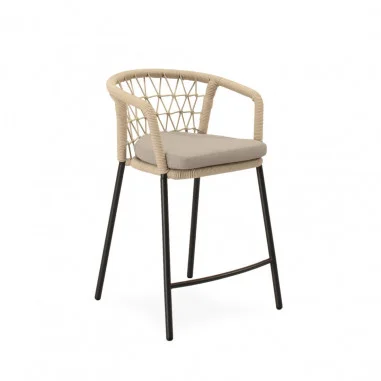 El taburete PIERRE combina un estilo contemporáneo con un diseño pensado para aportar comodidad y frescura a cualquier espacio exterior. Su respaldo curvo, elaborado en cuerda resistente, presenta un entramado lineal que crea un efecto visual ligero y dinámico. Esta estructura no solo envuelve suavemente la espalda, sino que también permite una...