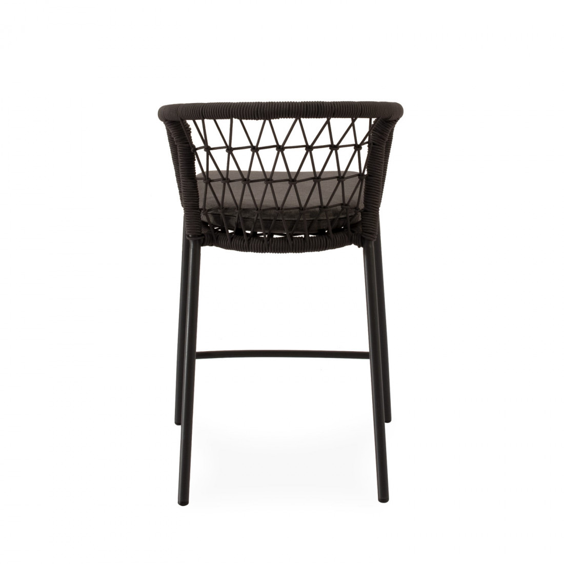 Las patas de acero cuidadosamente tratado para uso prolongado en exteriores, robustas y ligeramente inclinadas, garantizan estabilidad y un contraste moderno con el asiento acolchado en poliéster.